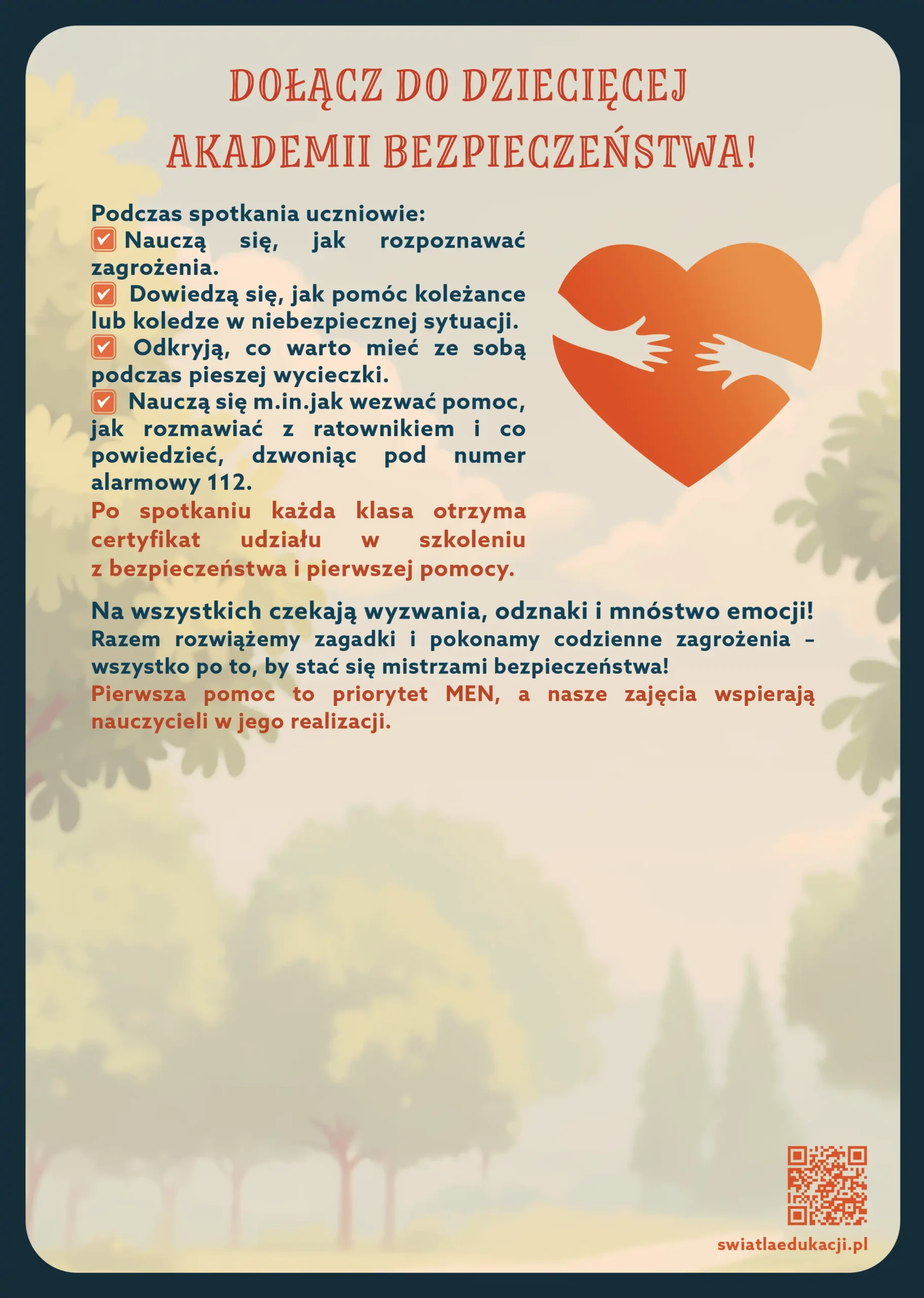 22 pździernika dzieci z grup 5 i 6 latków będą uczestniczyły w lekcji multimedialnej "Dziecięca Akademia Bezpieczeństwa", która odbędzie się w Centrum Kultury w Żyrardowie. Czas trwania to 2 godziny i 15 min (Pierwsza Pomoc + film "Niezgaszalni"). Koszt to 35 zł od dziecka po stronie rodzica, prosimy o dostarczenie odliczonej kwoty do wychowawców grup w terminie do 20.10.2025. Lekcja rozpoczyna się o godz. 8.30. W tym dniu śniadanie dla grup 5 i 6 latków będzie wydawane wyjątkowo wcześniej o godz. 7.45. Prosimy o wcześniejsze przyprowadzenie dzieci do przedszkola.