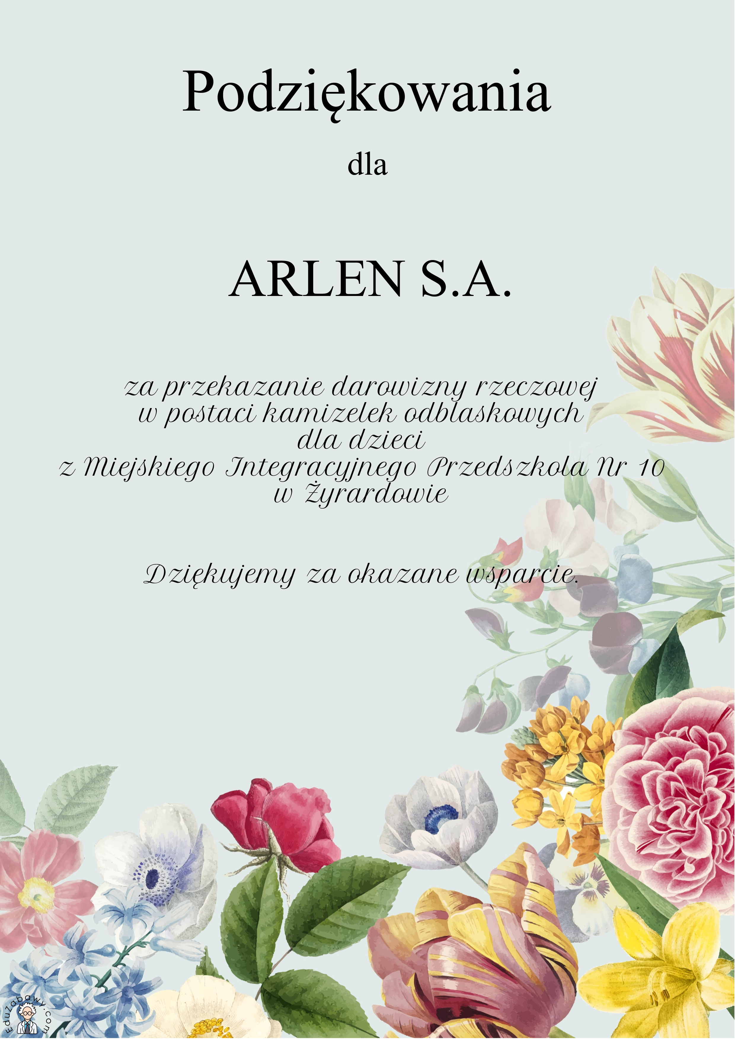 Dziękujemy firmie ARLEN S.A. za przekazanie darowizny rzeczowej w postaci kamizelek odblaskowych dla naszych przedszkolaków.