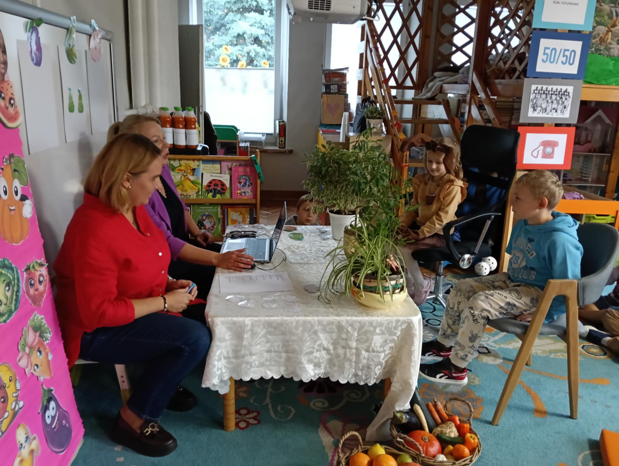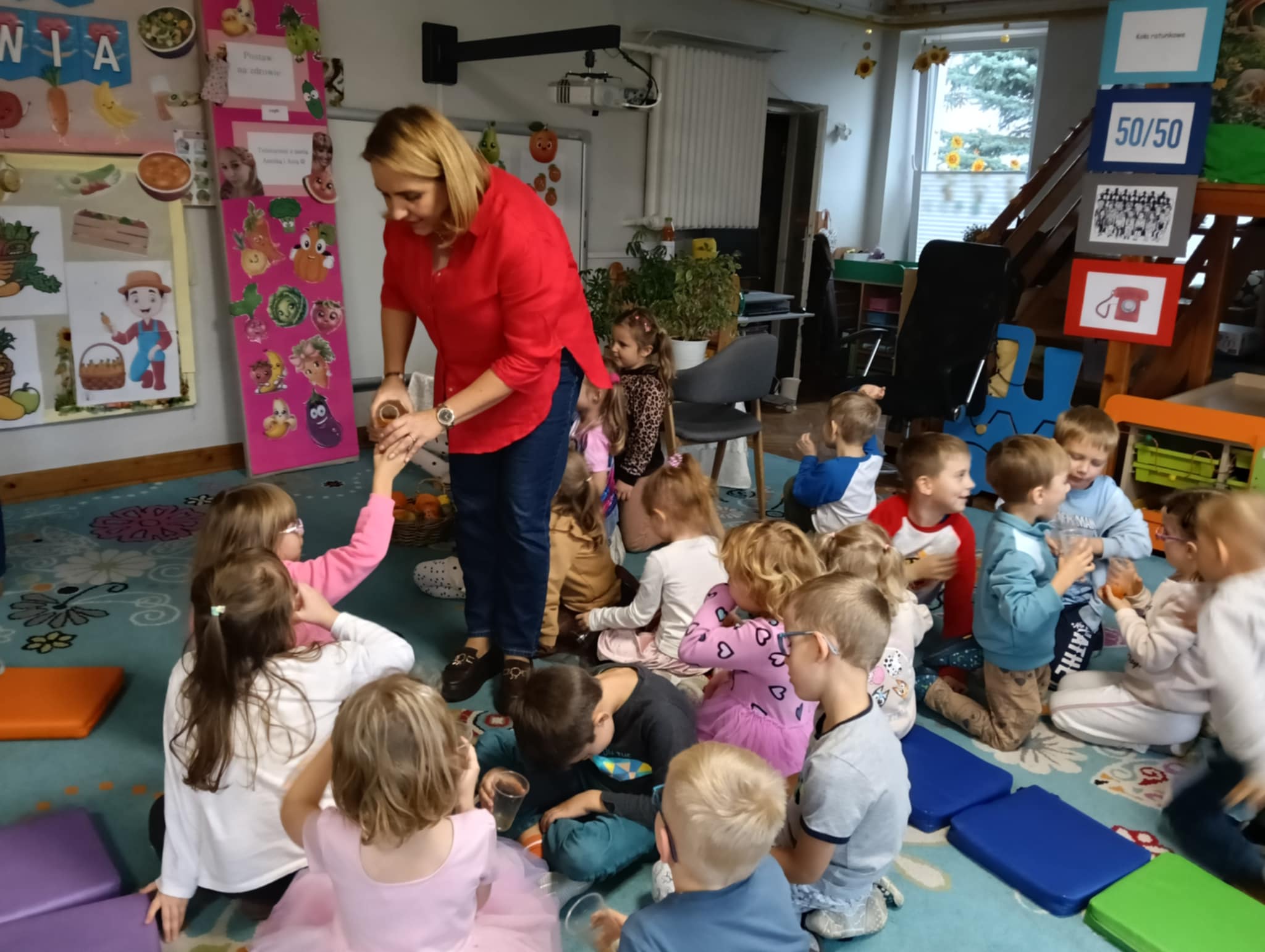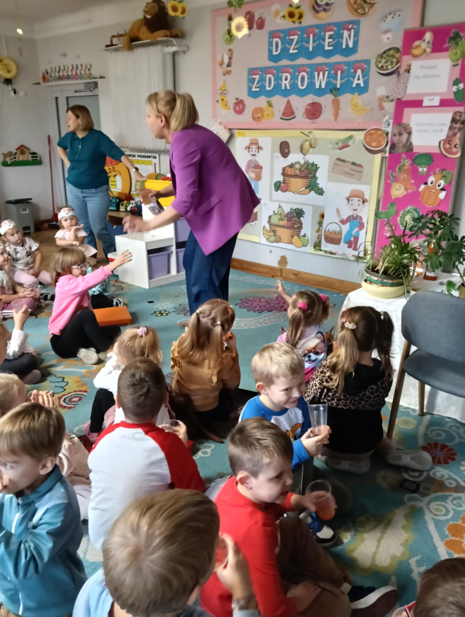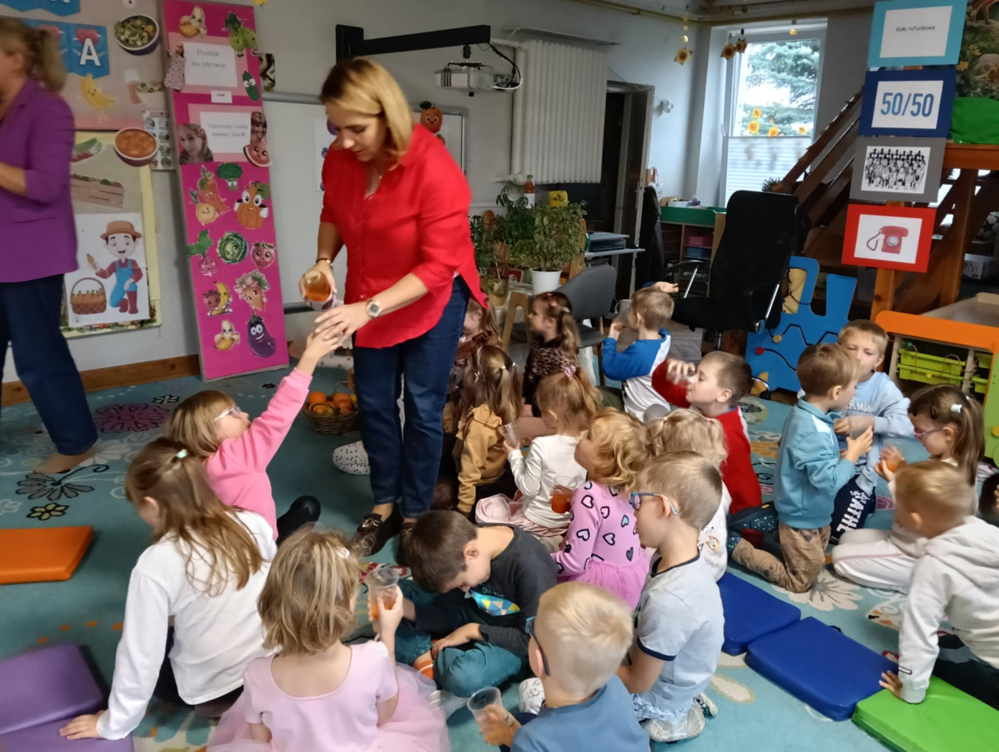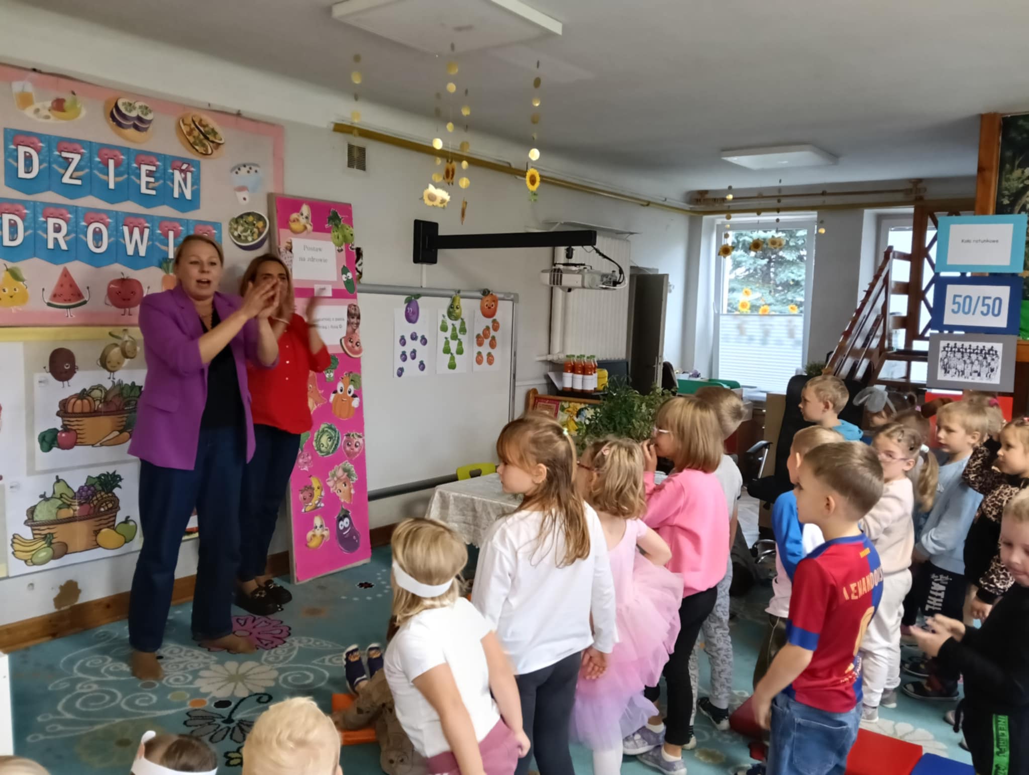 Dnia 24 października nasze przedszkolaki wzięły udział w wyjątkowym wydarzeniu promującym zdrowe odżywianie "Postaw na zdrowie" - czyli teleturniej z Paniami Anetką i Asią. Quiz ten miał na celu kształtowanie postaw prozdrowotnych i promowanie zdrowego stylu życia. W tym dniu było naprawdę wesoło, dzieci odpowiadały na pytania o zdrowiu, słuchały muzyki, zdobywały punkty w postaci owoców za prawidłowe odpowiedzi i piły eliksir zdrowia, który wyjątkowo dodawał im siły i rozjaśniał umysł do udzielania prawidłowych odpowiedzi. W ostateczności dzieci mogły skorzystać z koła ratunkowego w postaci telefonu do Pani Dyrektor, którego użyły tylko raz. Zabawa naprawdę była świetna!