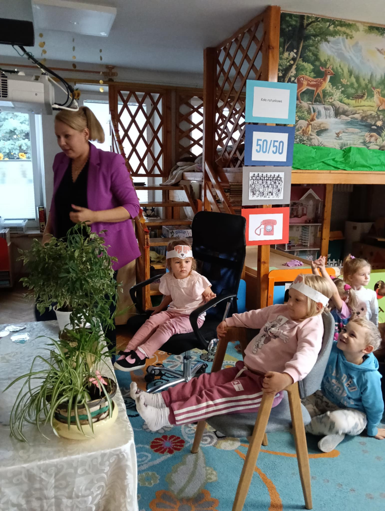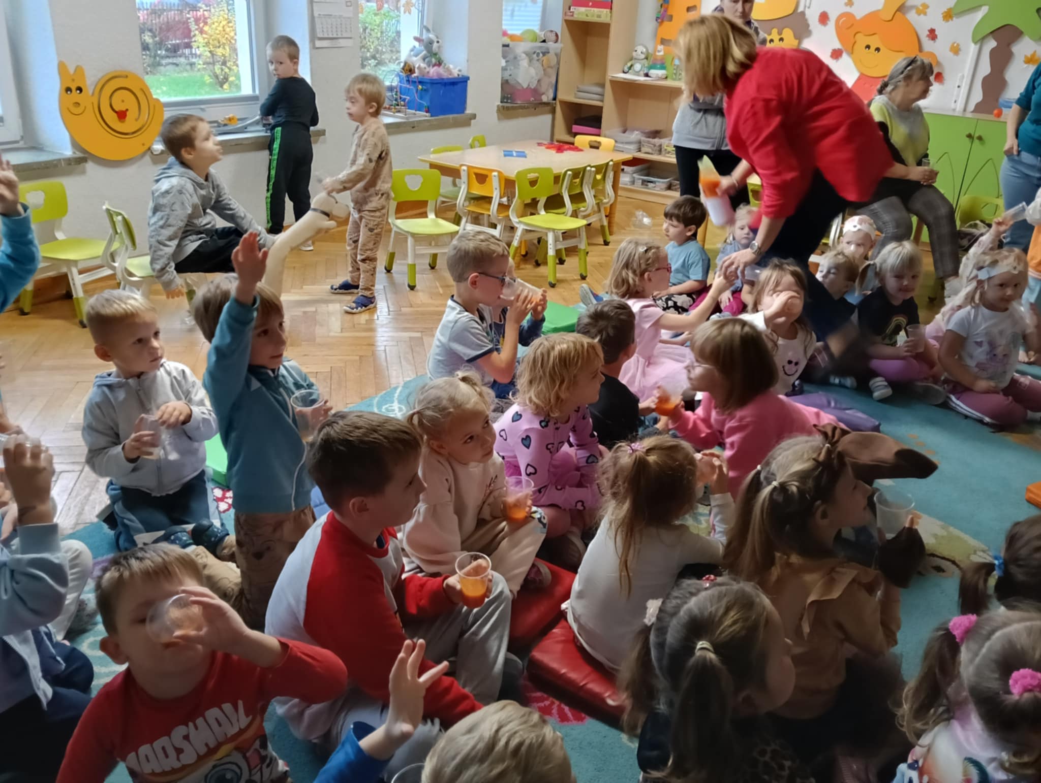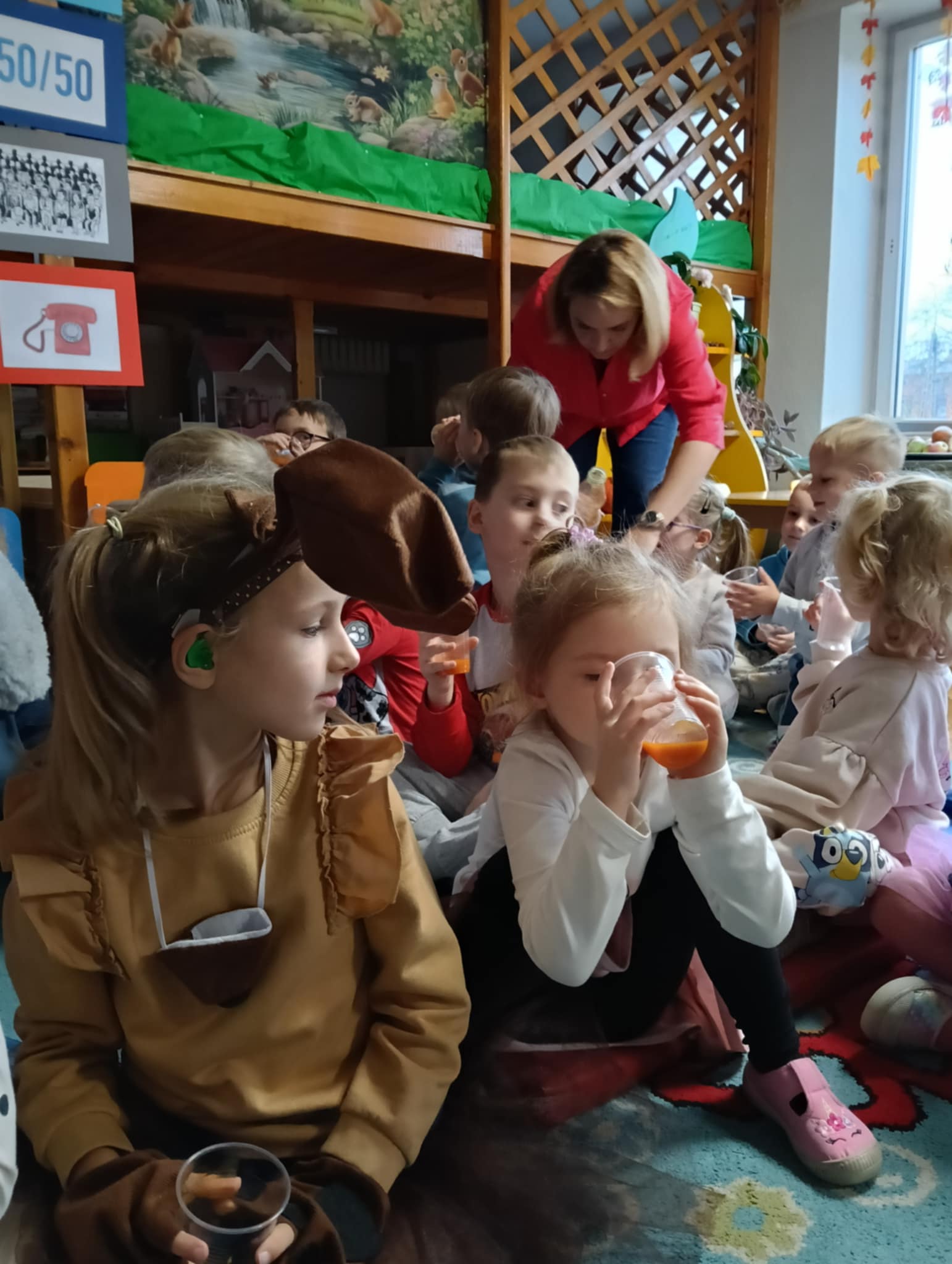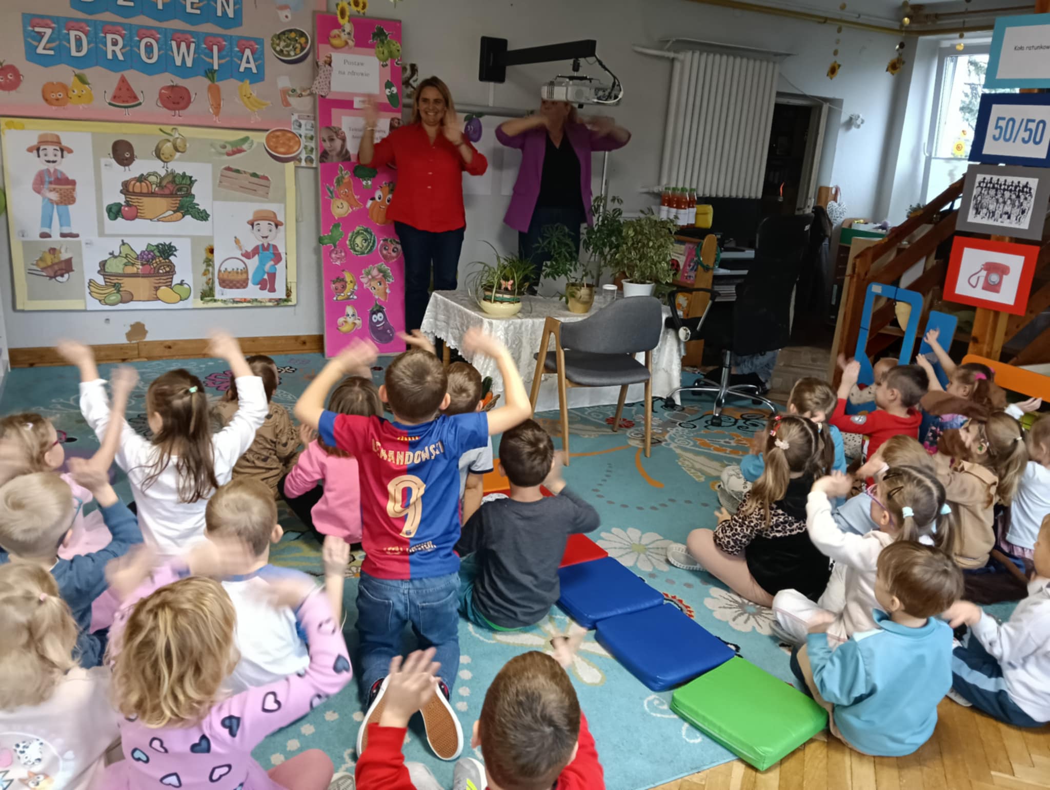 Dnia 24 października nasze przedszkolaki wzięły udział w wyjątkowym wydarzeniu promującym zdrowe odżywianie "Postaw na zdrowie" - czyli teleturniej z Paniami Anetką i Asią. Quiz ten miał na celu kształtowanie postaw prozdrowotnych i promowanie zdrowego stylu życia. W tym dniu było naprawdę wesoło, dzieci odpowiadały na pytania o zdrowiu, słuchały muzyki, zdobywały punkty w postaci owoców za prawidłowe odpowiedzi i piły eliksir zdrowia, który wyjątkowo dodawał im siły i rozjaśniał umysł do udzielania prawidłowych odpowiedzi. W ostateczności dzieci mogły skorzystać z koła ratunkowego w postaci telefonu do Pani Dyrektor, którego użyły tylko raz. Zabawa naprawdę była świetna!