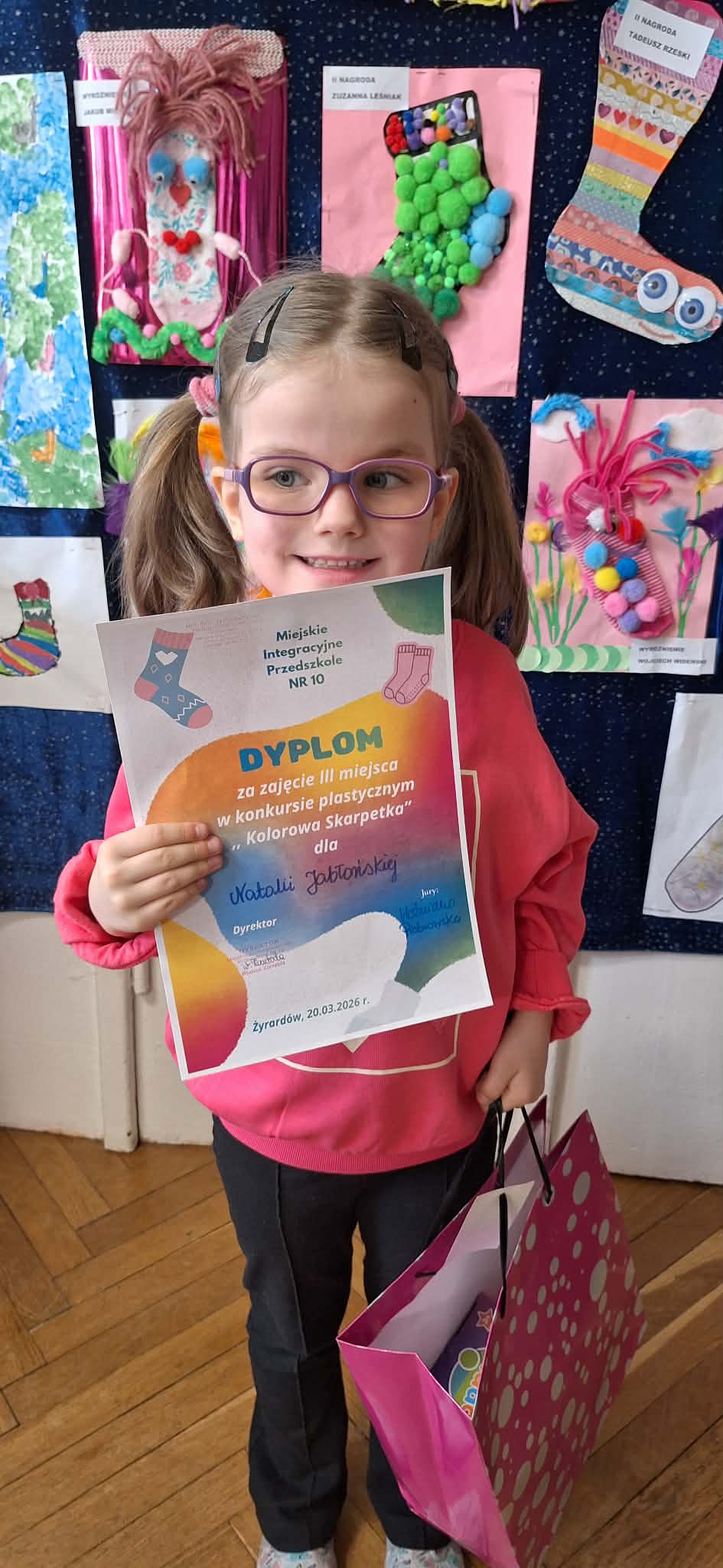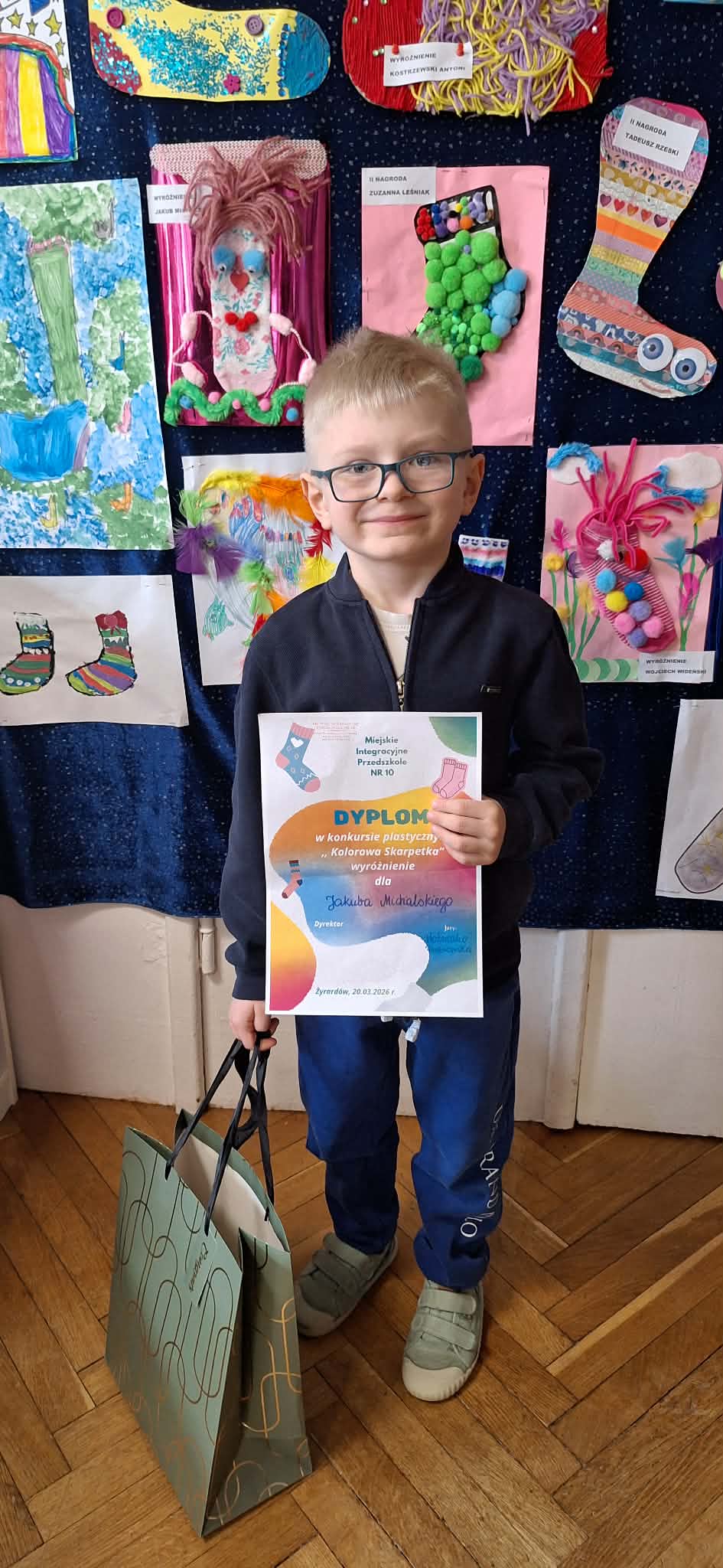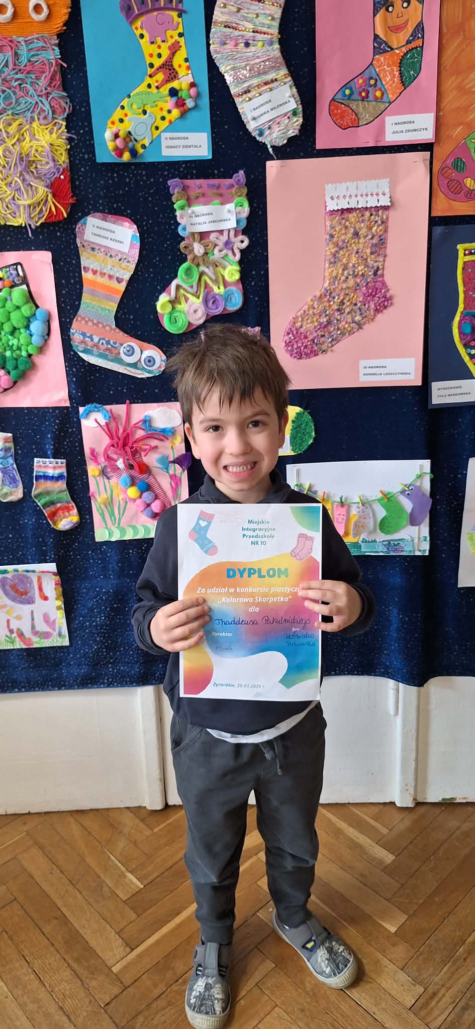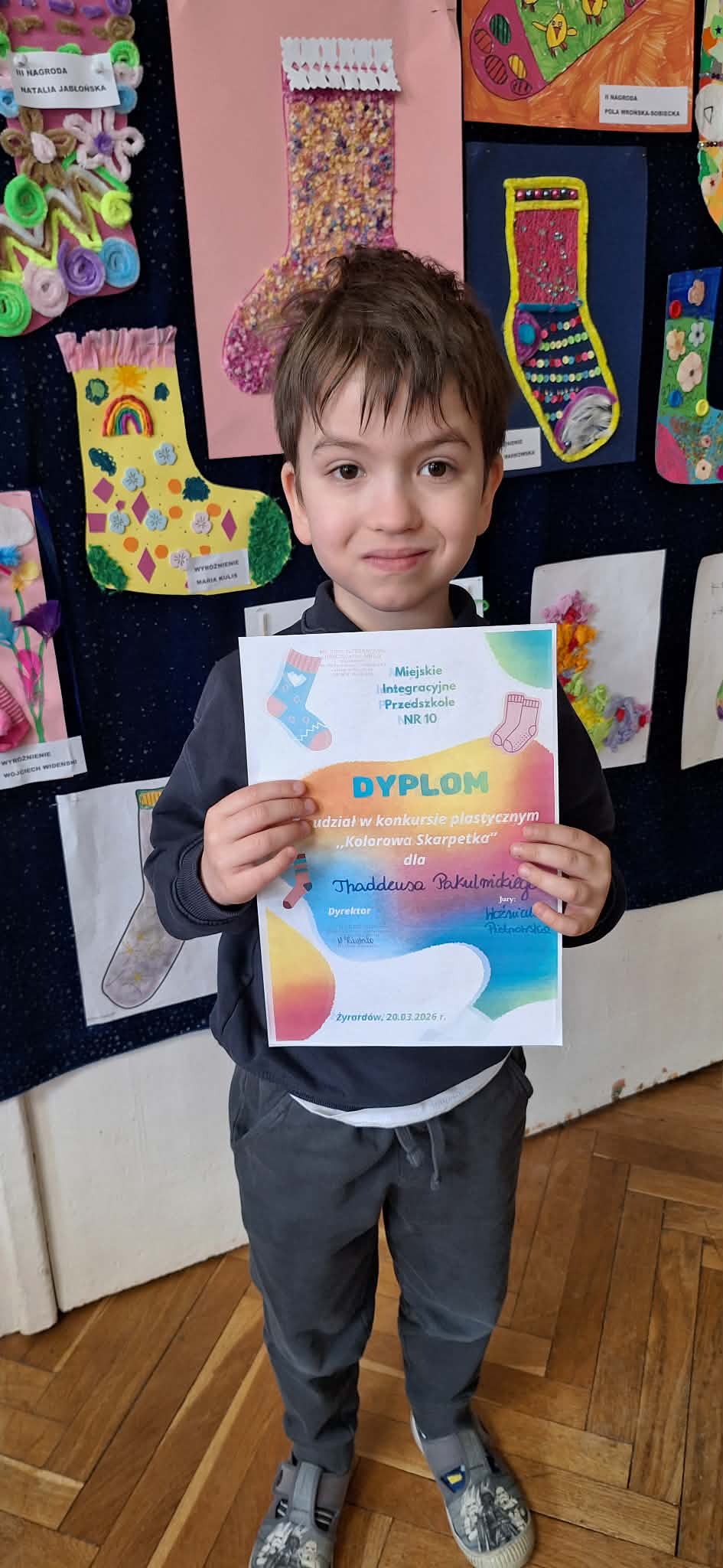 W dniu 20.03.2026 r. w przed dzień Światowego Dnia Zespołu Dawna w naszym przedszkolu odbyło się rozstrzygnięcie konkursu pastycznego "Kolorowa skarpetka". Obchody tego dnia miały uświadomić przedszkolakom, że różnorodność jest piękna, a każdy z Nas jest wyjątkowy. Tę różnorodność najlepiej wytłumaszczyć na przykładzie prac, które wpłynęły w konkursie. Każda stworzona przez dzieci skarpetka była inna, wyjątkowa, niepowtarzalna i w tym właśnie tkwi ich piękno. Tak samo jak skarpetki ludzie mogą być różni i to czyni ich wyjątkowymi. Konkurs, którego byliśmy organizatorami skierowany był do dzieci z miejskich przedszkoli z terenu miasta Żyrardowa. Prace wpłynęły bardzo licznie, oprócz naszych przedszkolaków w konkursie wzieły udział również dzieci z Miejskiego Przedszkola Nr 5 oraz Miejskiego Przedszkola Nr 9, wśród autorów prac zostali wyłonieni laureaci w 4 kategoriach wiekowych: