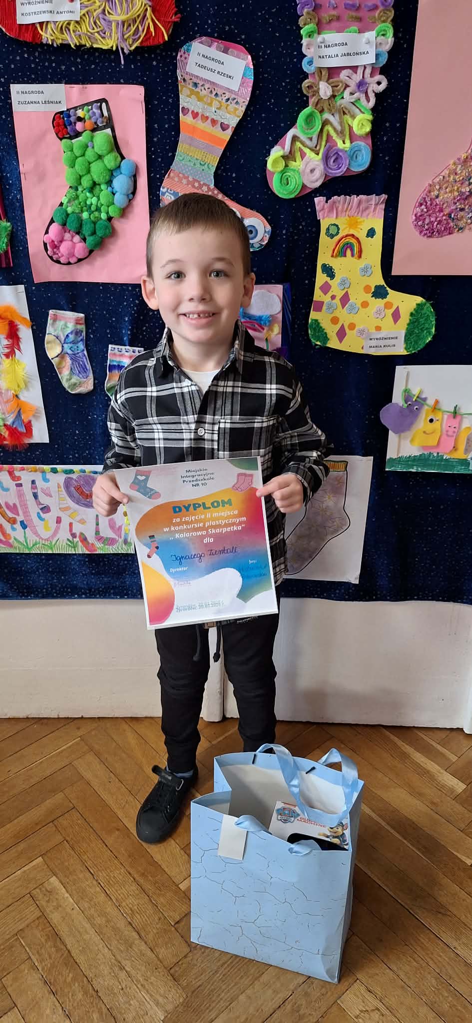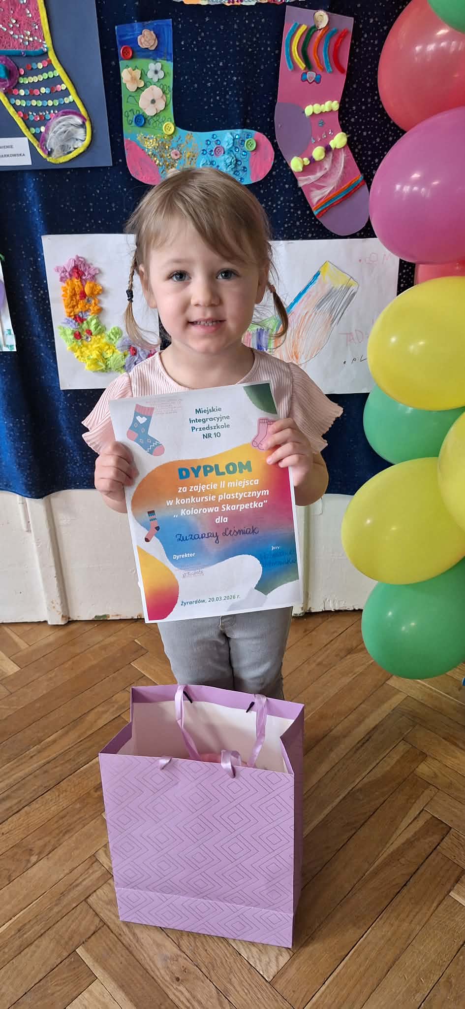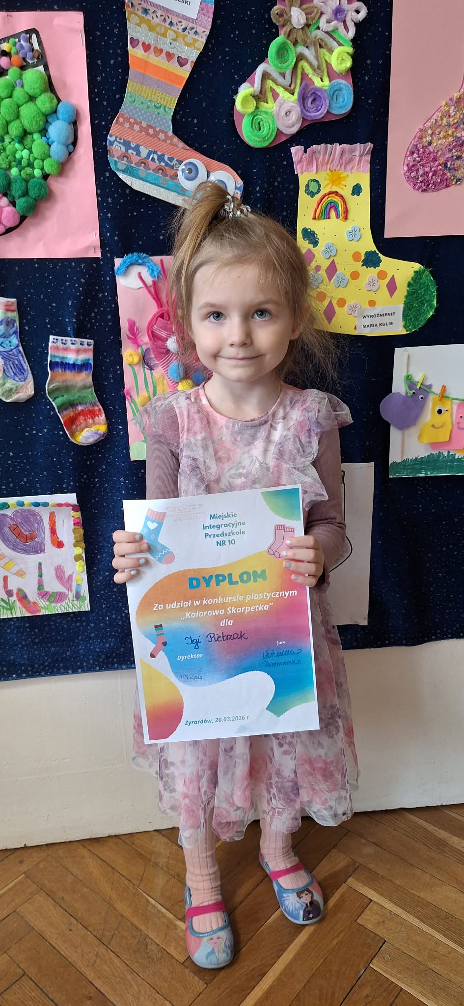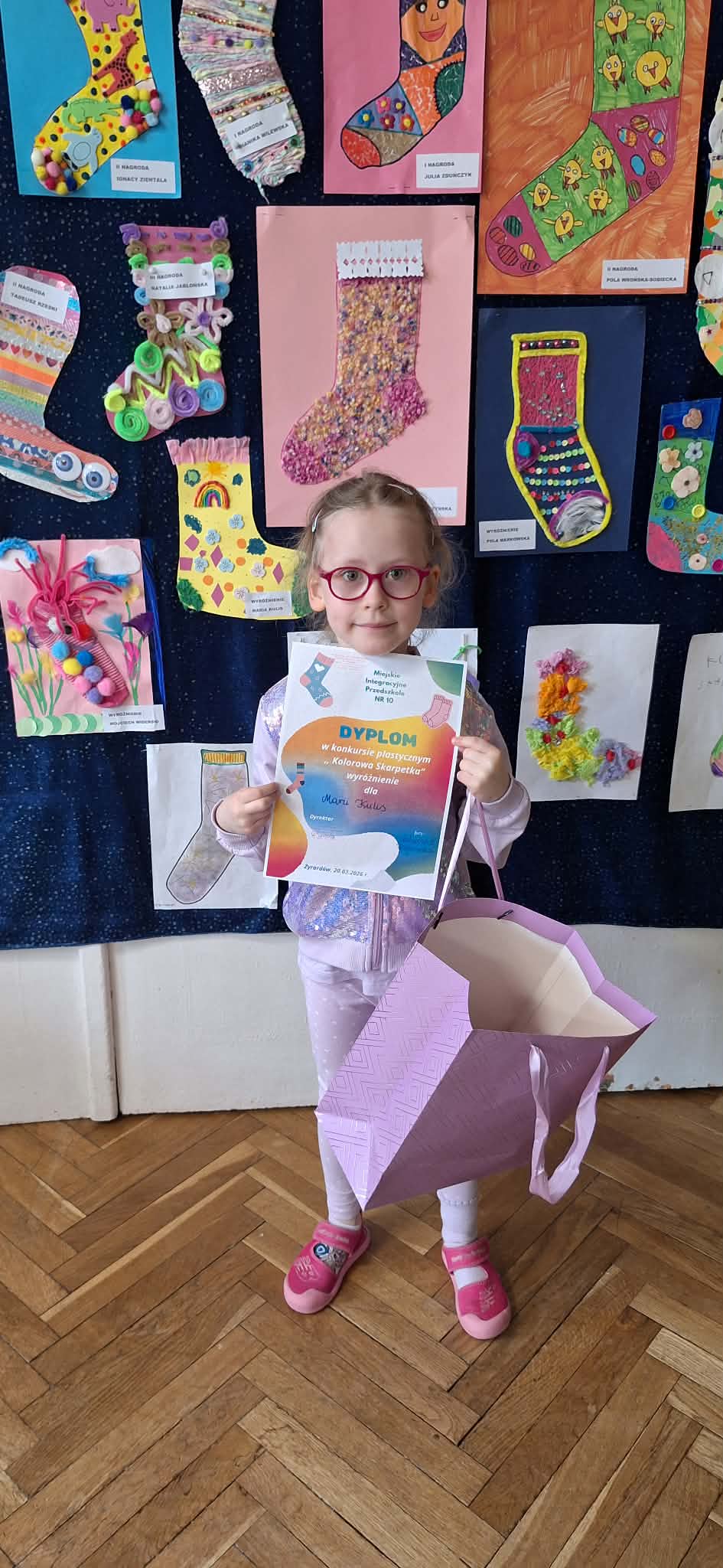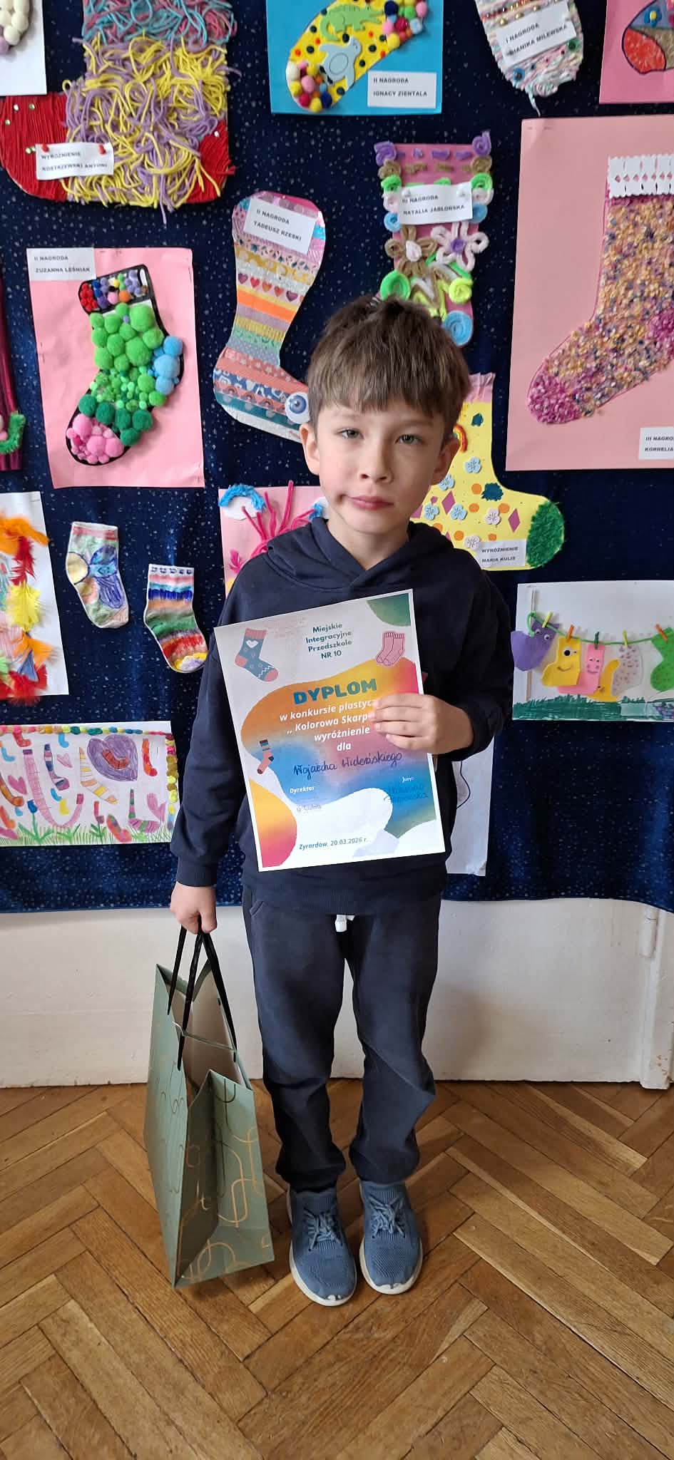 W dniu 20.03.2026 r. w przed dzień Światowego Dnia Zespołu Dawna w naszym przedszkolu odbyło się rozstrzygnięcie konkursu pastycznego "Kolorowa skarpetka". Obchody tego dnia miały uświadomić przedszkolakom, że różnorodność jest piękna, a każdy z Nas jest wyjątkowy. Tę różnorodność najlepiej wytłumaszczyć na przykładzie prac, które wpłynęły w konkursie. Każda stworzona przez dzieci skarpetka była inna, wyjątkowa, niepowtarzalna i w tym właśnie tkwi ich piękno. Tak samo jak skarpetki ludzie mogą być różni i to czyni ich wyjątkowymi. Konkurs, którego byliśmy organizatorami skierowany był do dzieci z miejskich przedszkoli z terenu miasta Żyrardowa. Prace wpłynęły bardzo licznie, oprócz naszych przedszkolaków w konkursie wzieły udział również dzieci z Miejskiego Przedszkola Nr 5 oraz Miejskiego Przedszkola Nr 9, wśród autorów prac zostali wyłonieni laureaci w 4 kategoriach wiekowych: