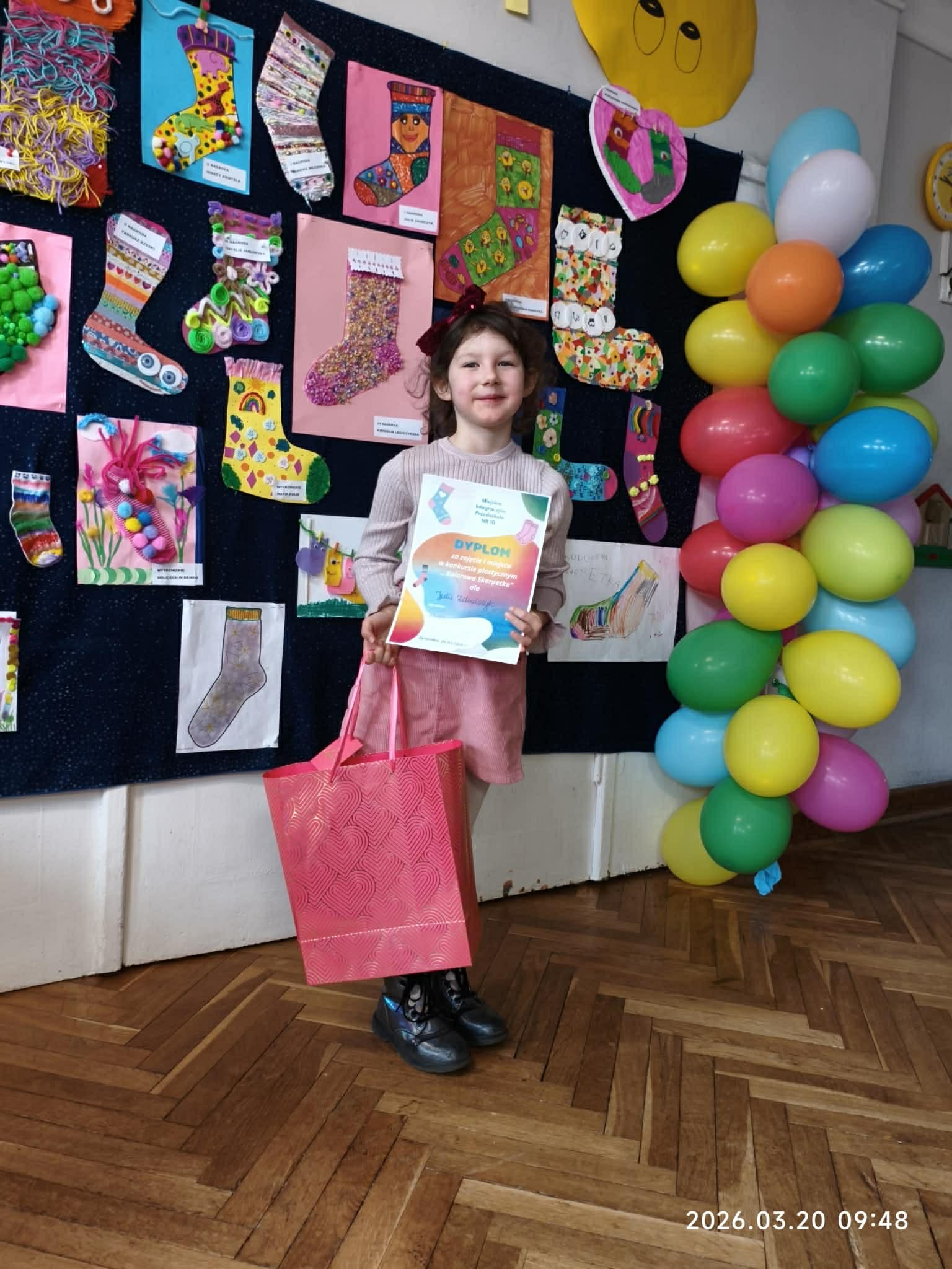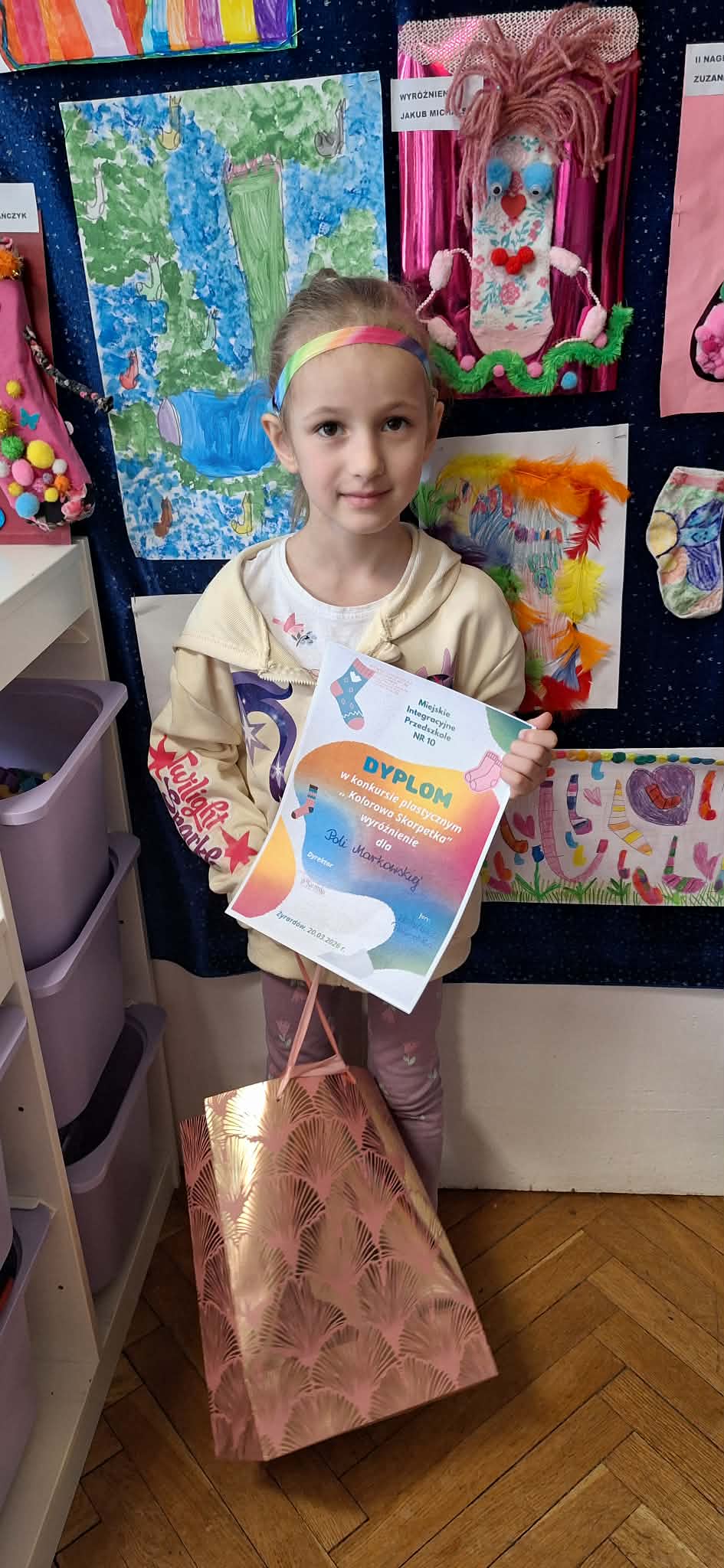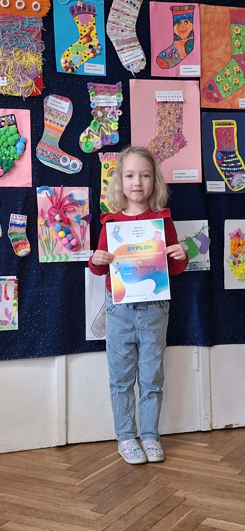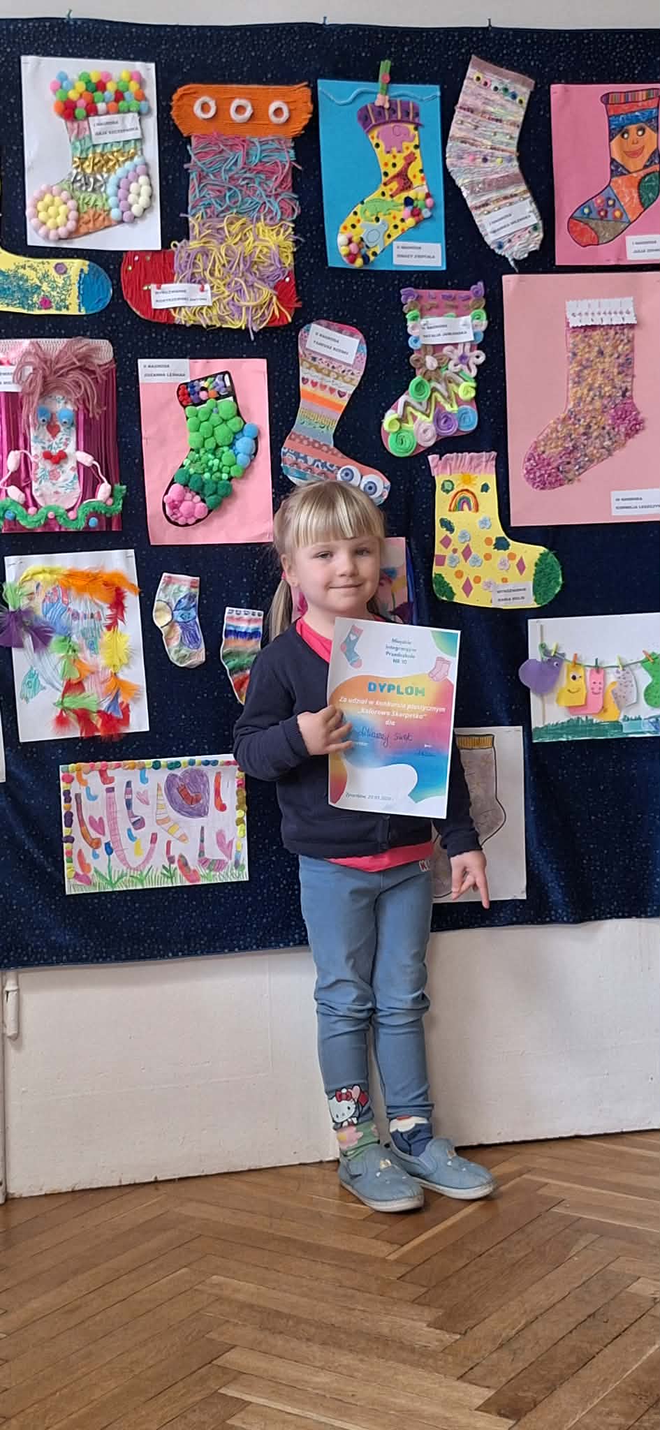 W dniu 20.03.2026 r. w przed dzień Światowego Dnia Zespołu Dawna w naszym przedszkolu odbyło się rozstrzygnięcie konkursu pastycznego "Kolorowa skarpetka". Obchody tego dnia miały uświadomić przedszkolakom, że różnorodność jest piękna, a każdy z Nas jest wyjątkowy. Tę różnorodność najlepiej wytłumaszczyć na przykładzie prac, które wpłynęły w konkursie. Każda stworzona przez dzieci skarpetka była inna, wyjątkowa, niepowtarzalna i w tym właśnie tkwi ich piękno. Tak samo jak skarpetki ludzie mogą być różni i to czyni ich wyjątkowymi. Konkurs, którego byliśmy organizatorami skierowany był do dzieci z miejskich przedszkoli z terenu miasta Żyrardowa. Prace wpłynęły bardzo licznie, oprócz naszych przedszkolaków w konkursie wzieły udział również dzieci z Miejskiego Przedszkola Nr 5 oraz Miejskiego Przedszkola Nr 9, wśród autorów prac zostali wyłonieni laureaci w 4 kategoriach wiekowych: