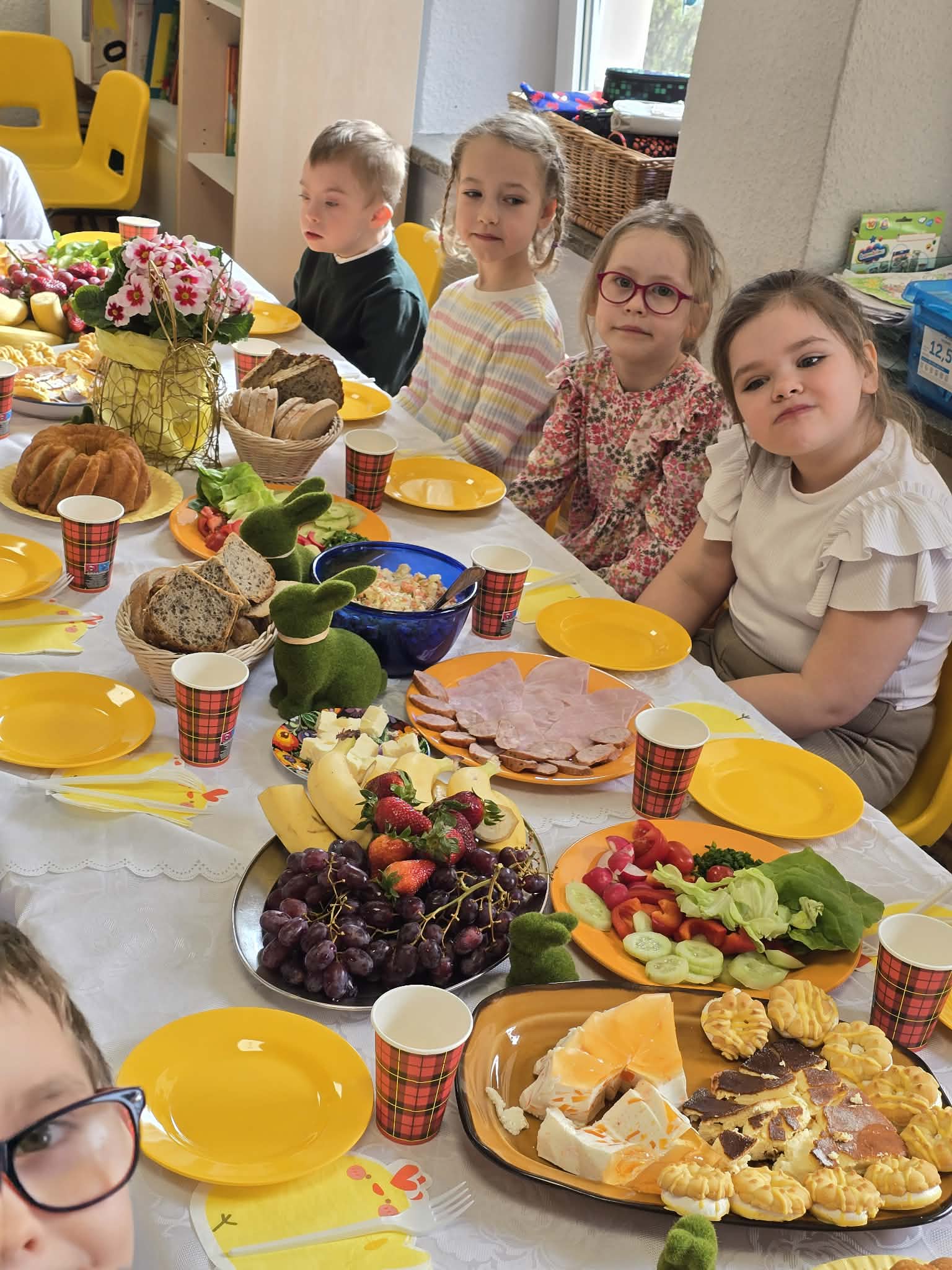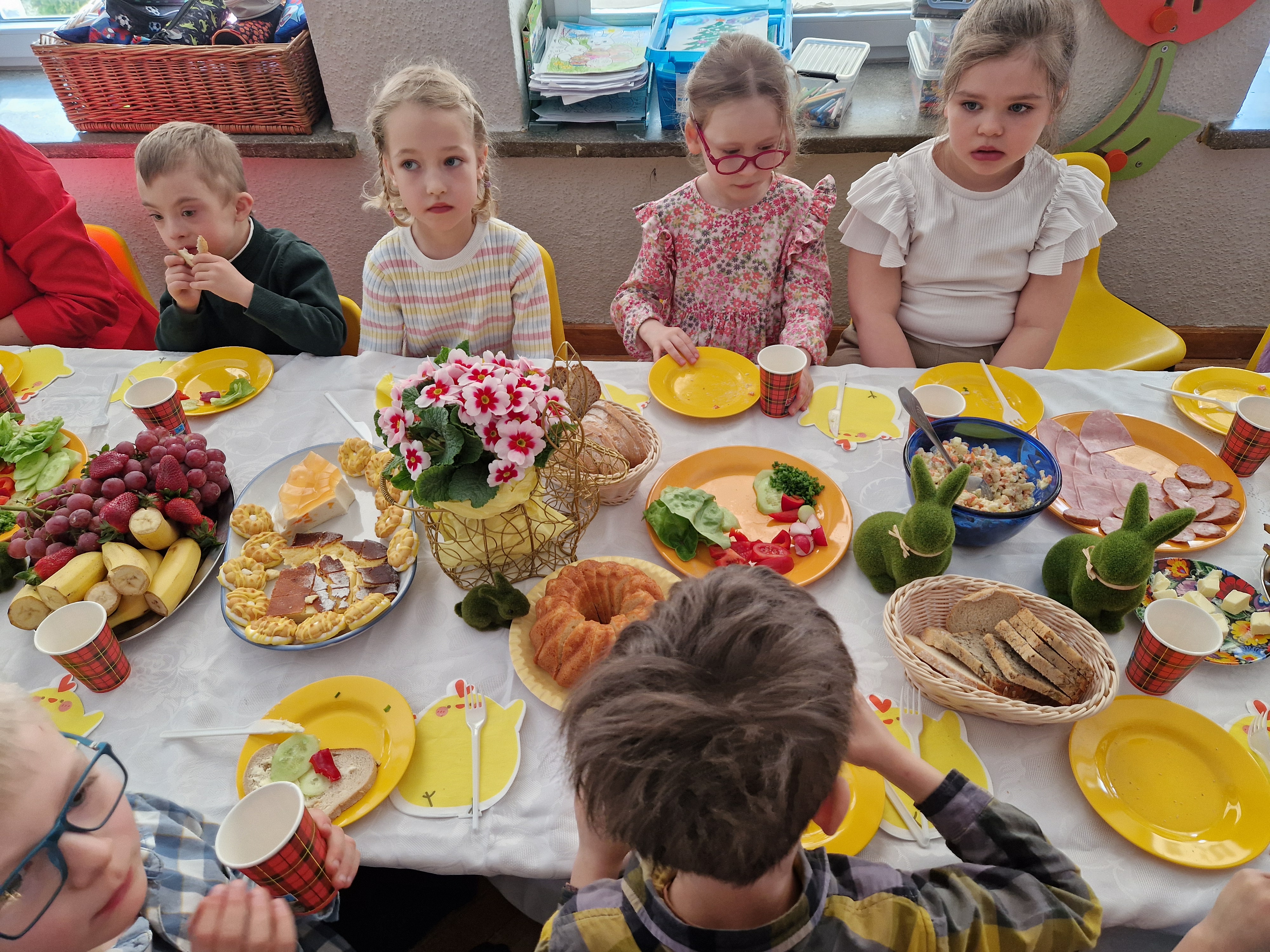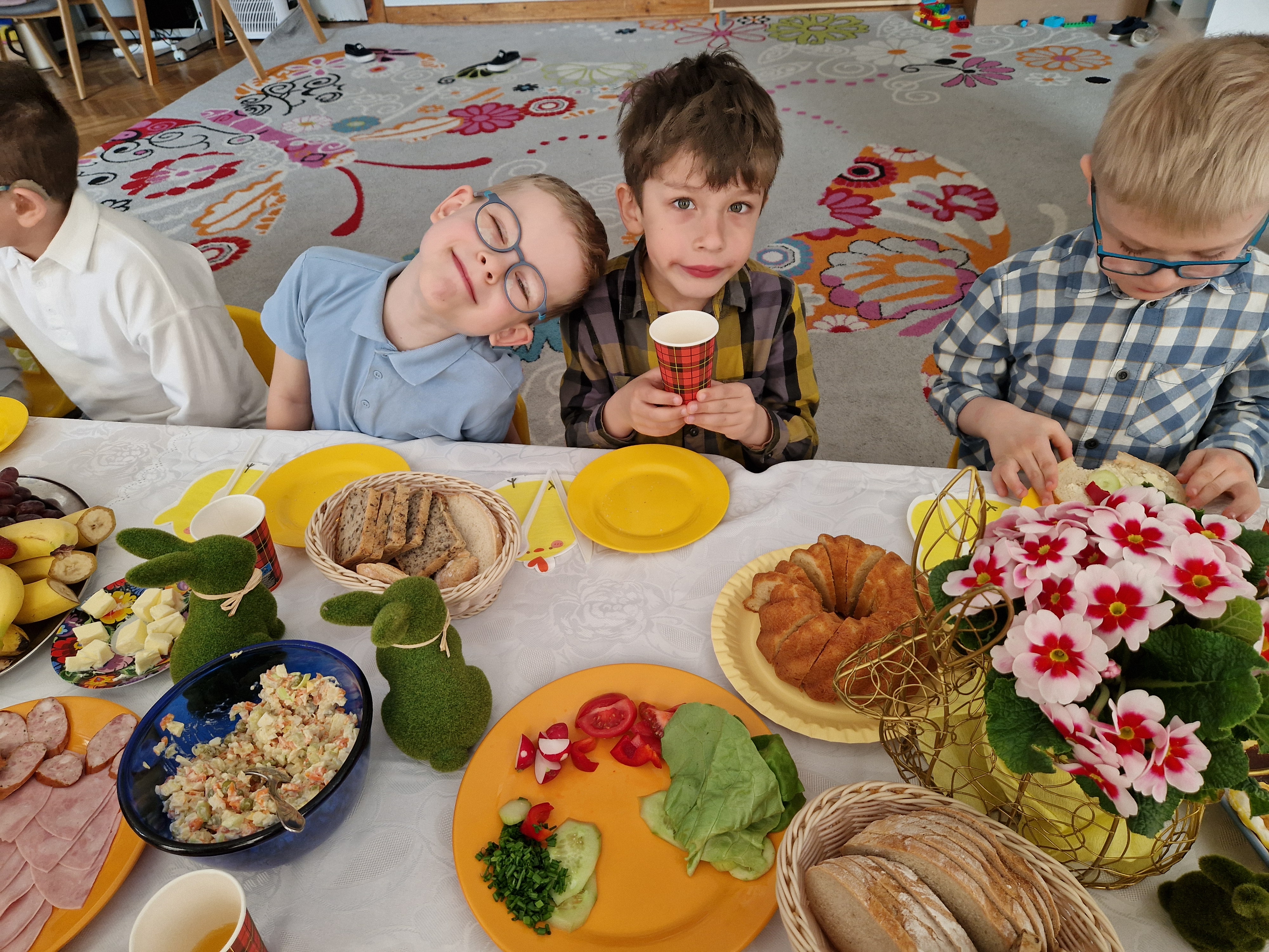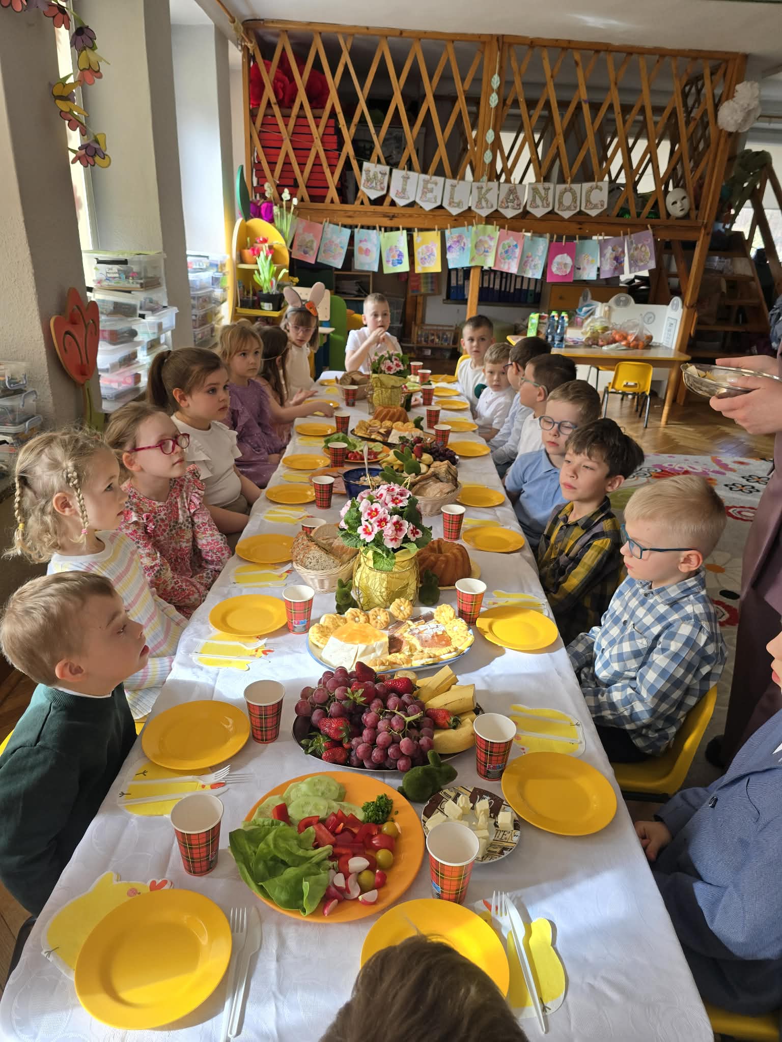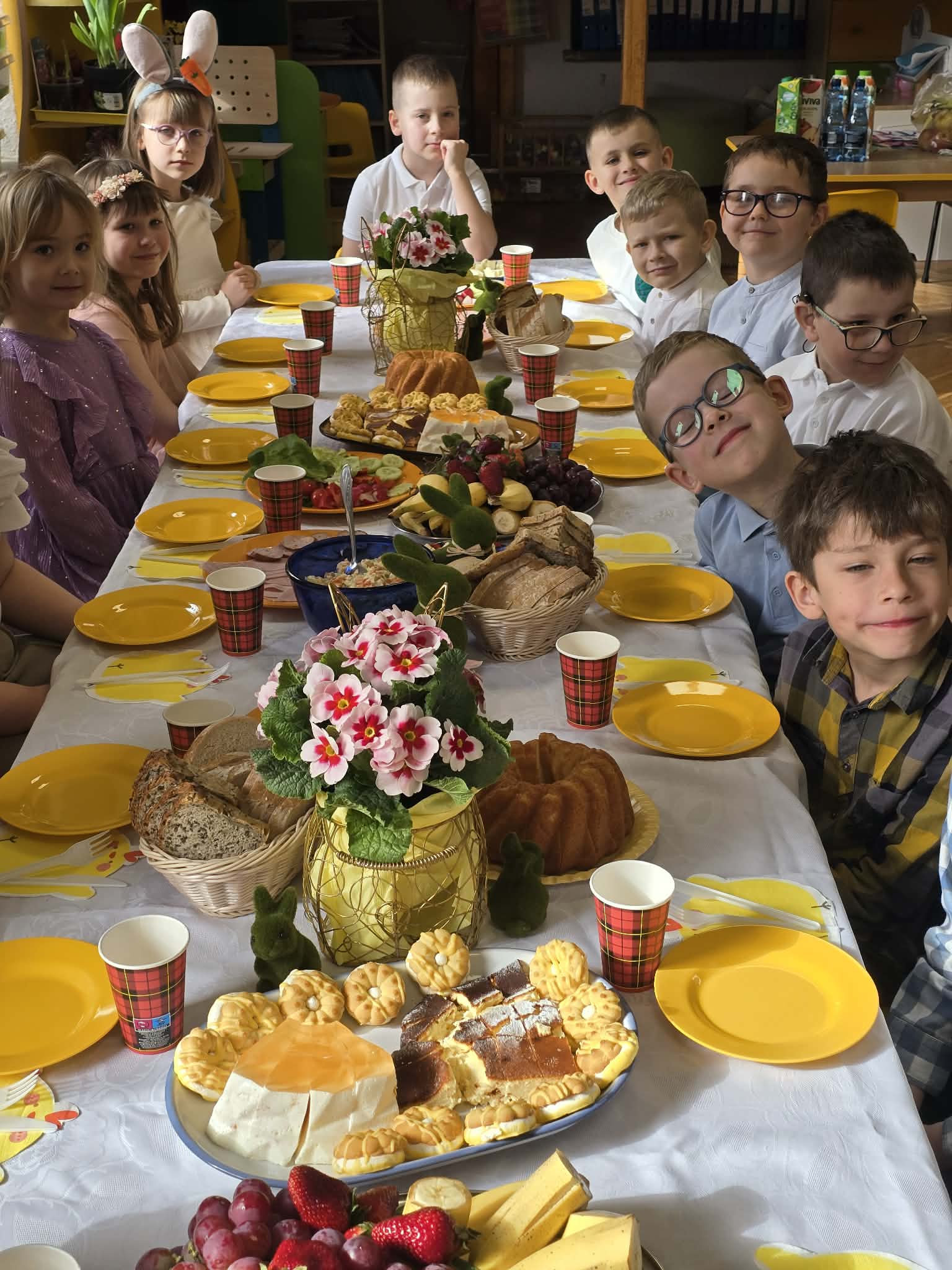 W środę 1 kwietnia w naszym przedszkolu odbyło się uroczyste śniadanie wielkanocne. Na świątecznych stołach nie mogło zabraknąć jajka, szyneczki, baranka z ciasta, stroików z żonkili i bukszpanów. Śniadanie rozpoczęto się od życzeń, które Pani Dyrektor złożyła każdej z grup. Następnie przedszkolaki w odświętnych strojach zasiadły do pięknych stołów zastawionych pokarmami wielkanocnymi. Ten dzień miał wyjątkowy charakter; dzieci śpiewały piosenki i bawiły się w zabawy związane z tradycjami wielkanocnymi. Po śniadaniu wyszły na plac przedszkolny gdzie zajączek wielkanocny zostawił dla nich ukryte słodkie niespodzianki w postaci czekoladowych jajeczek. Spotkanie przy wspólnym świątecznym stole sprawiło dzieciom wiele radości.