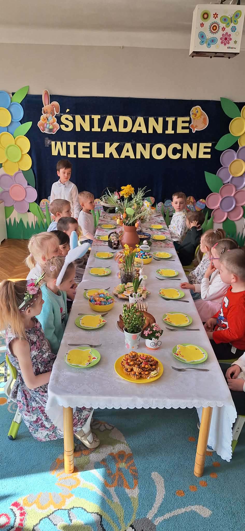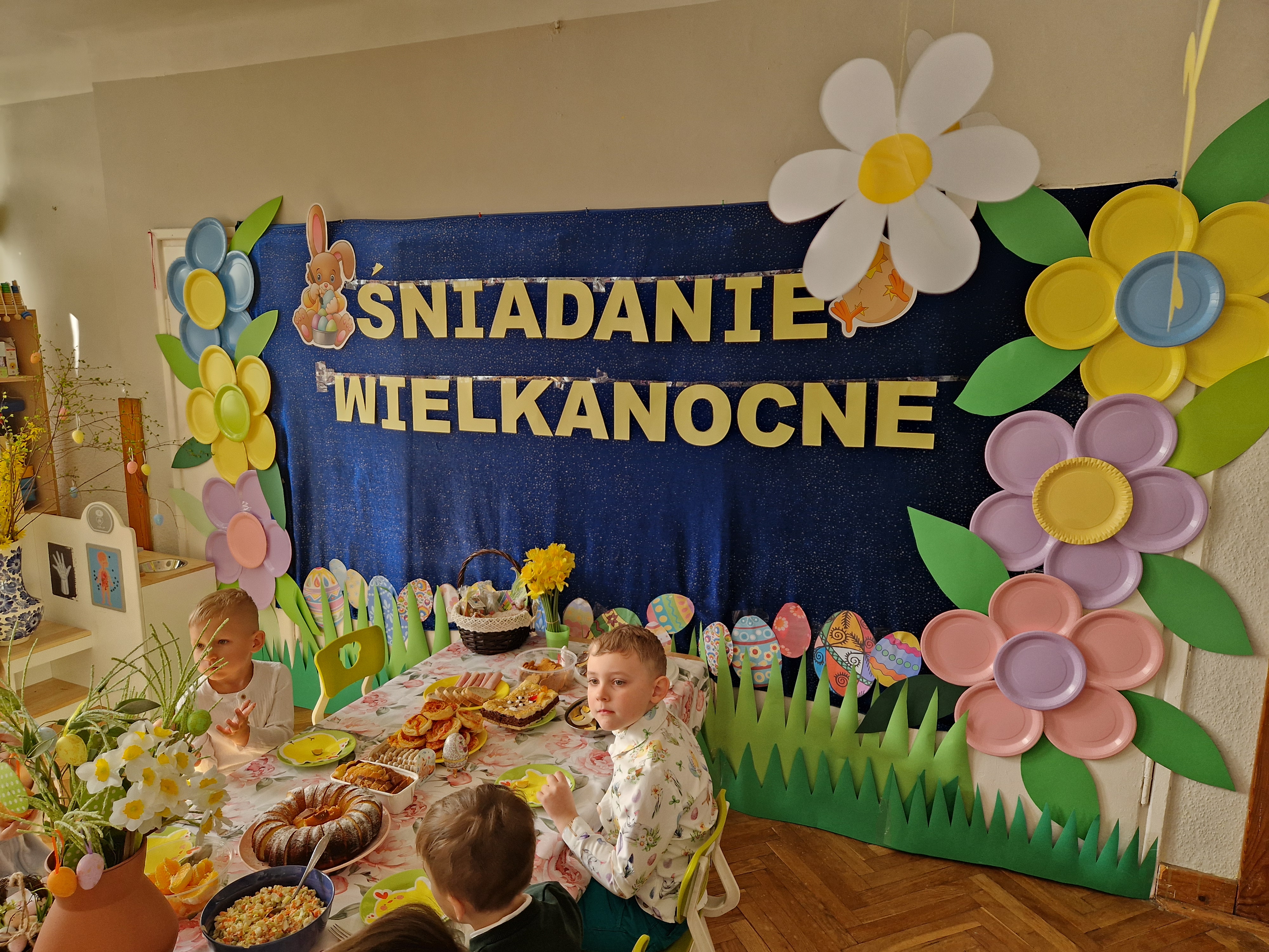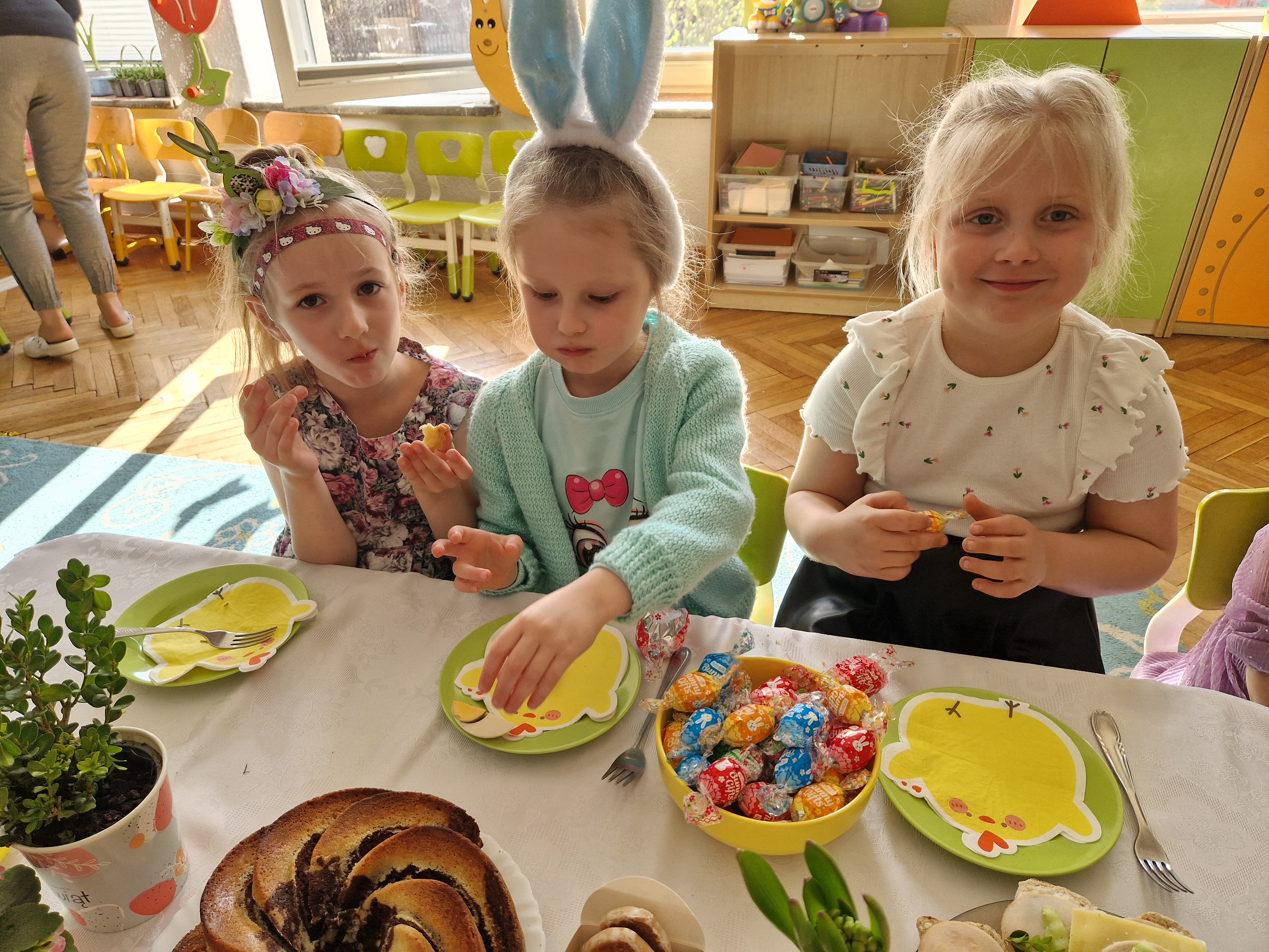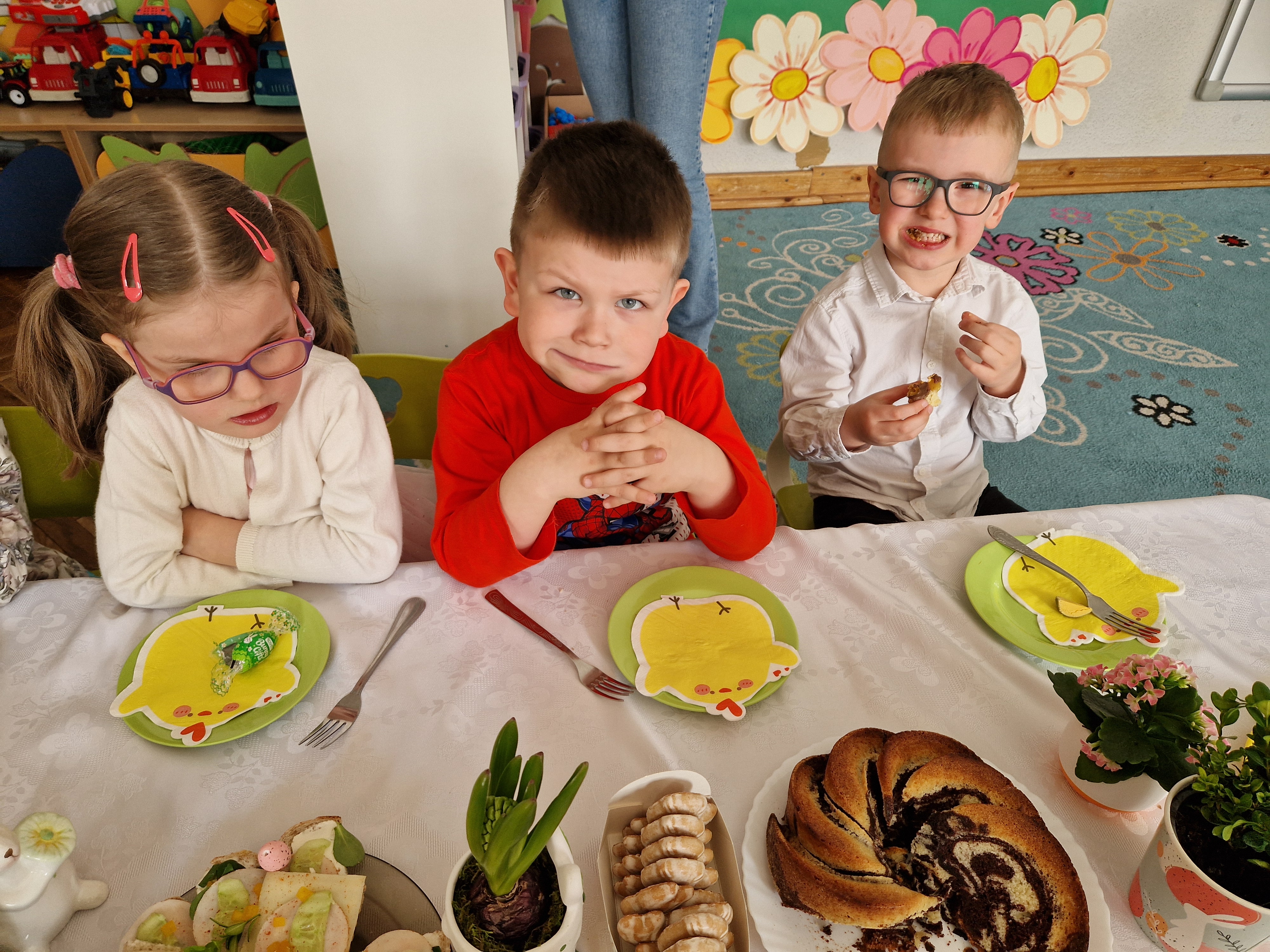 W środę 1 kwietnia w naszym przedszkolu odbyło się uroczyste śniadanie wielkanocne. Na świątecznych stołach nie mogło zabraknąć jajka, szyneczki, baranka z ciasta, stroików z żonkili i bukszpanów. Śniadanie rozpoczęto się od życzeń, które Pani Dyrektor złożyła każdej z grup. Następnie przedszkolaki w odświętnych strojach zasiadły do pięknych stołów zastawionych pokarmami wielkanocnymi. Ten dzień miał wyjątkowy charakter; dzieci śpiewały piosenki i bawiły się w zabawy związane z tradycjami wielkanocnymi. Po śniadaniu wyszły na plac przedszkolny gdzie zajączek wielkanocny zostawił dla nich ukryte słodkie niespodzianki w postaci czekoladowych jajeczek. Spotkanie przy wspólnym świątecznym stole sprawiło dzieciom wiele radości.