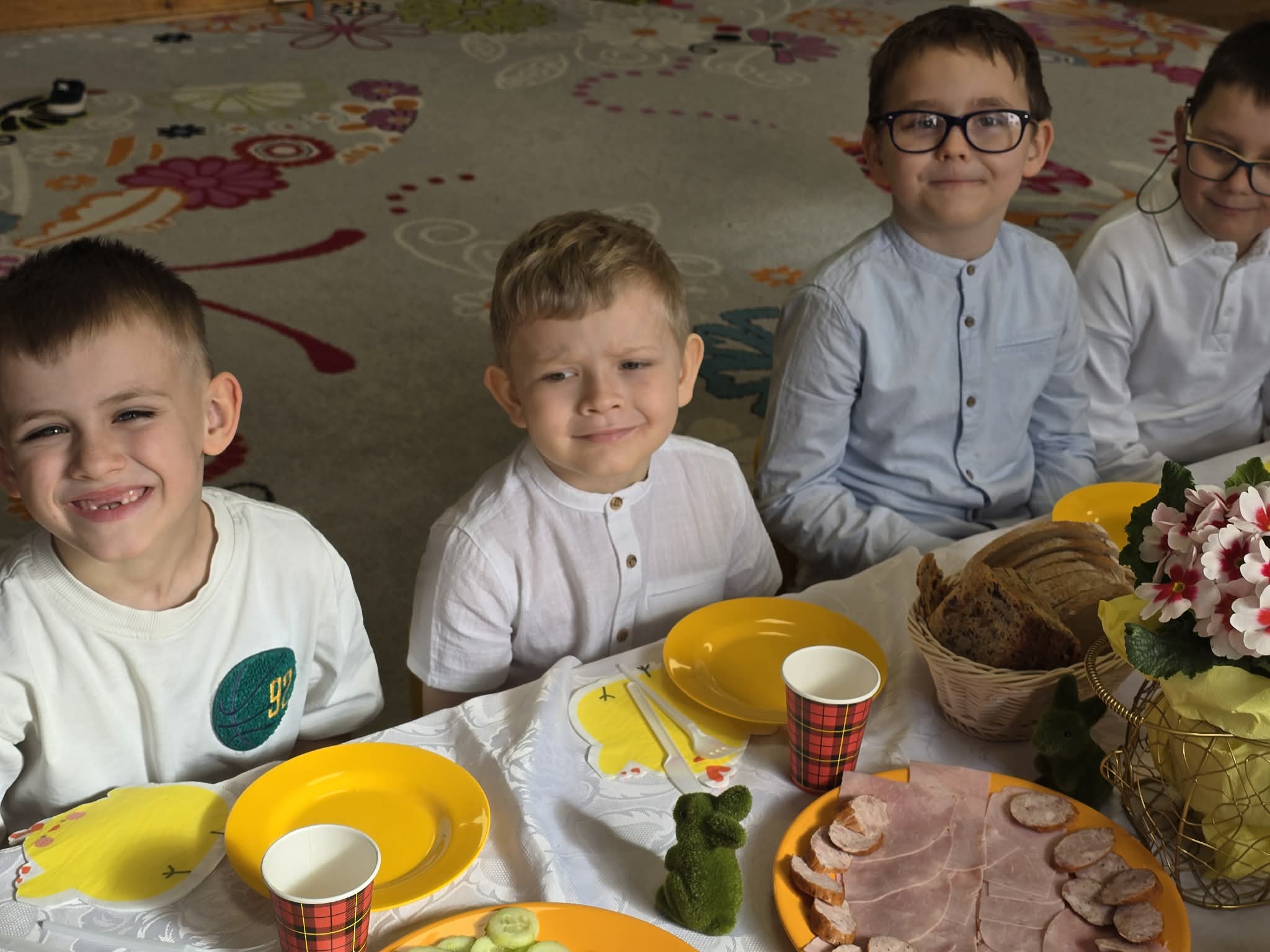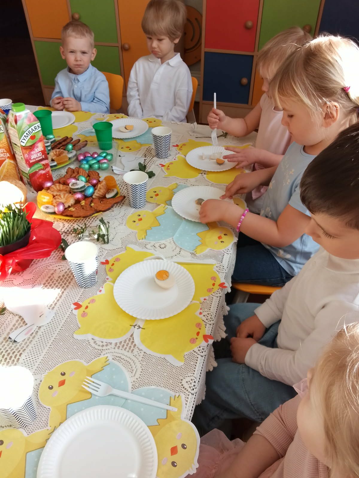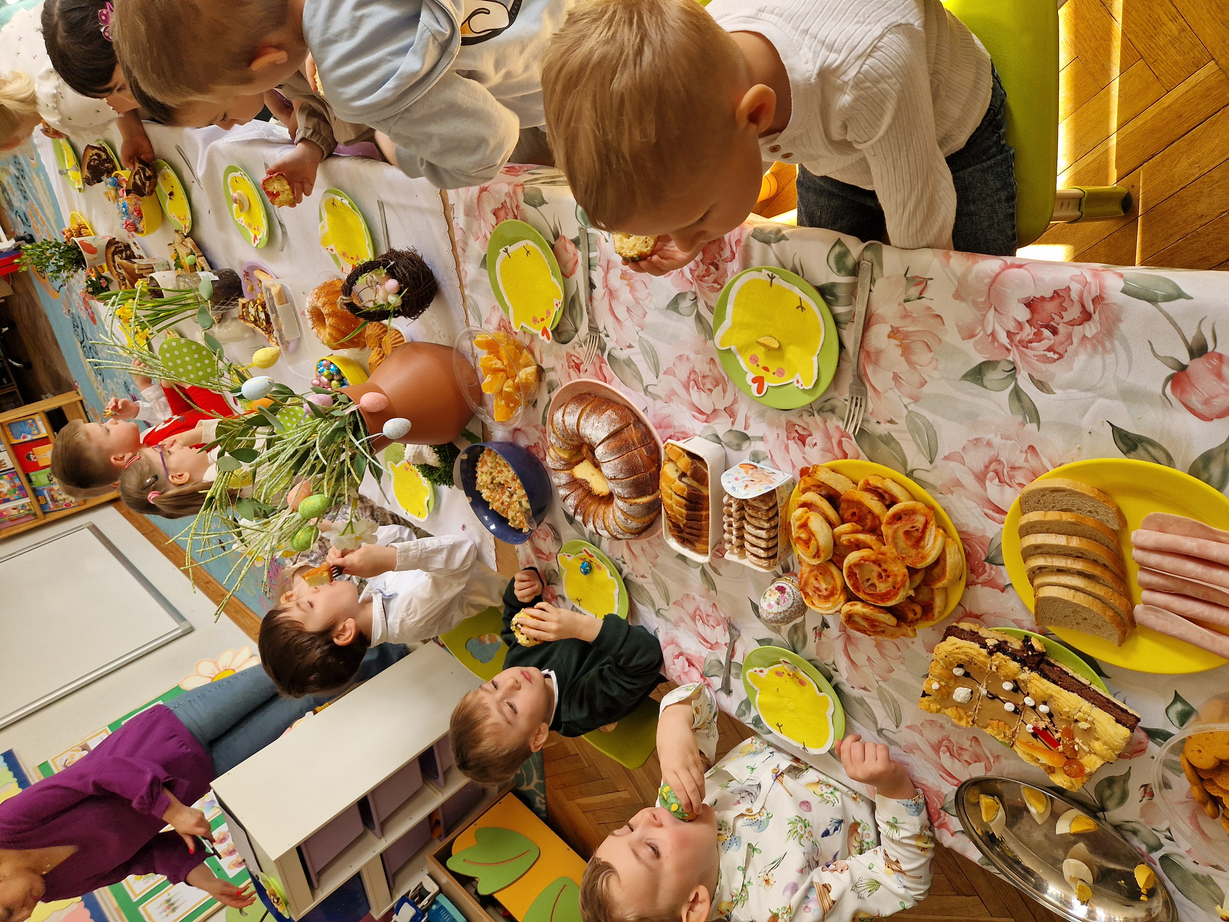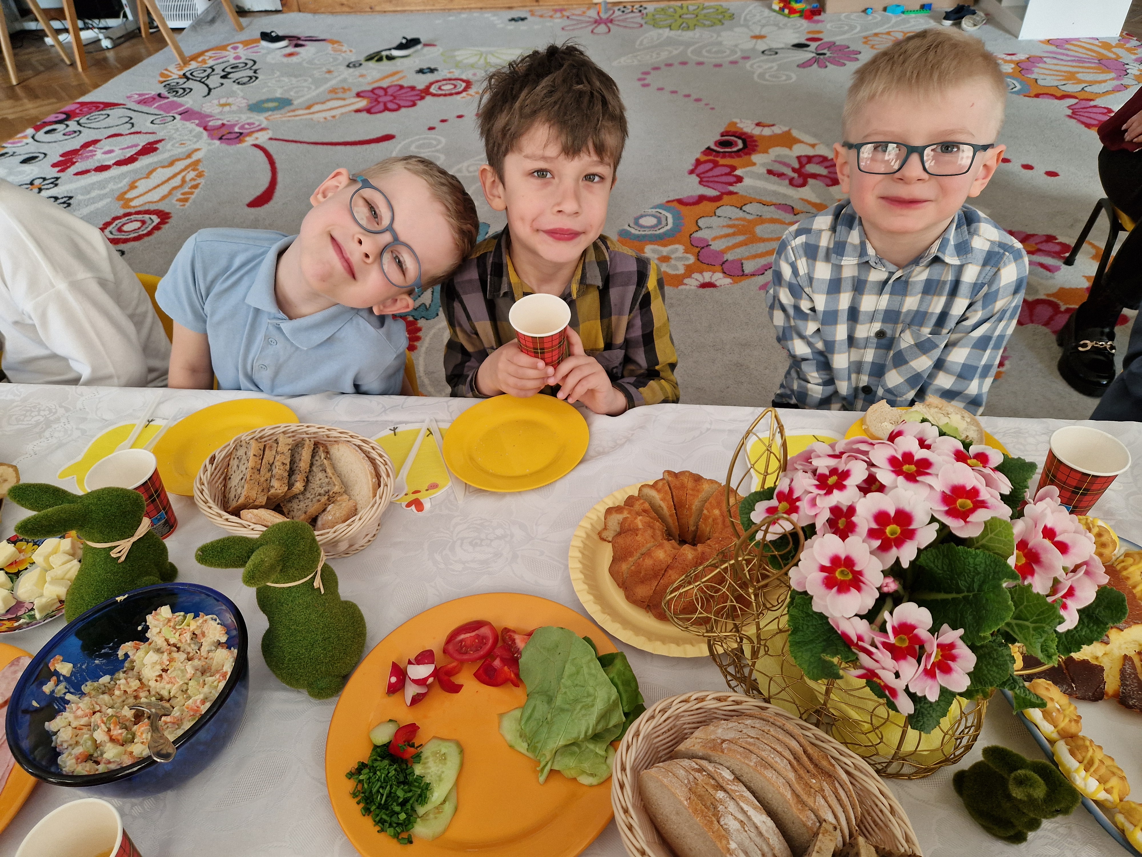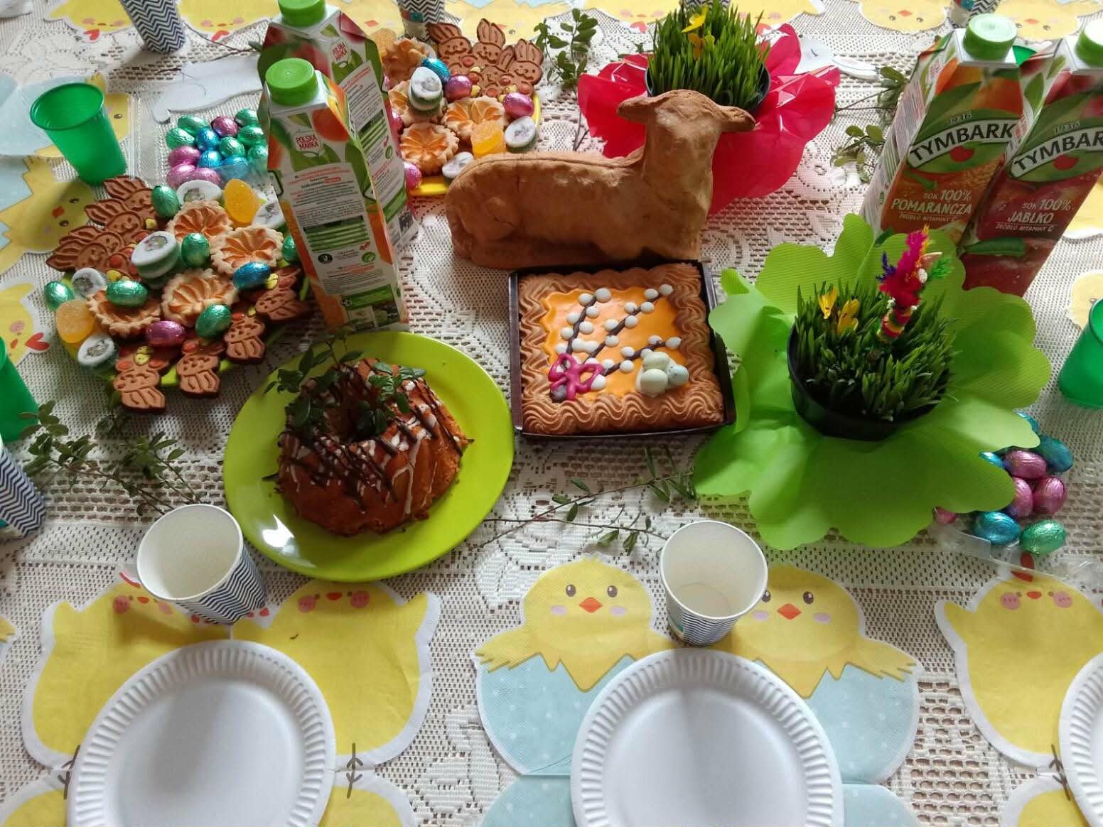 W środę 1 kwietnia w naszym przedszkolu odbyło się uroczyste śniadanie wielkanocne. Na świątecznych stołach nie mogło zabraknąć jajka, szyneczki, baranka z ciasta, stroików z żonkili i bukszpanów. Śniadanie rozpoczęto się od życzeń, które Pani Dyrektor złożyła każdej z grup. Następnie przedszkolaki w odświętnych strojach zasiadły do pięknych stołów zastawionych pokarmami wielkanocnymi. Ten dzień miał wyjątkowy charakter; dzieci śpiewały piosenki i bawiły się w zabawy związane z tradycjami wielkanocnymi. Po śniadaniu wyszły na plac przedszkolny gdzie zajączek wielkanocny zostawił dla nich ukryte słodkie niespodzianki w postaci czekoladowych jajeczek. Spotkanie przy wspólnym świątecznym stole sprawiło dzieciom wiele radości.