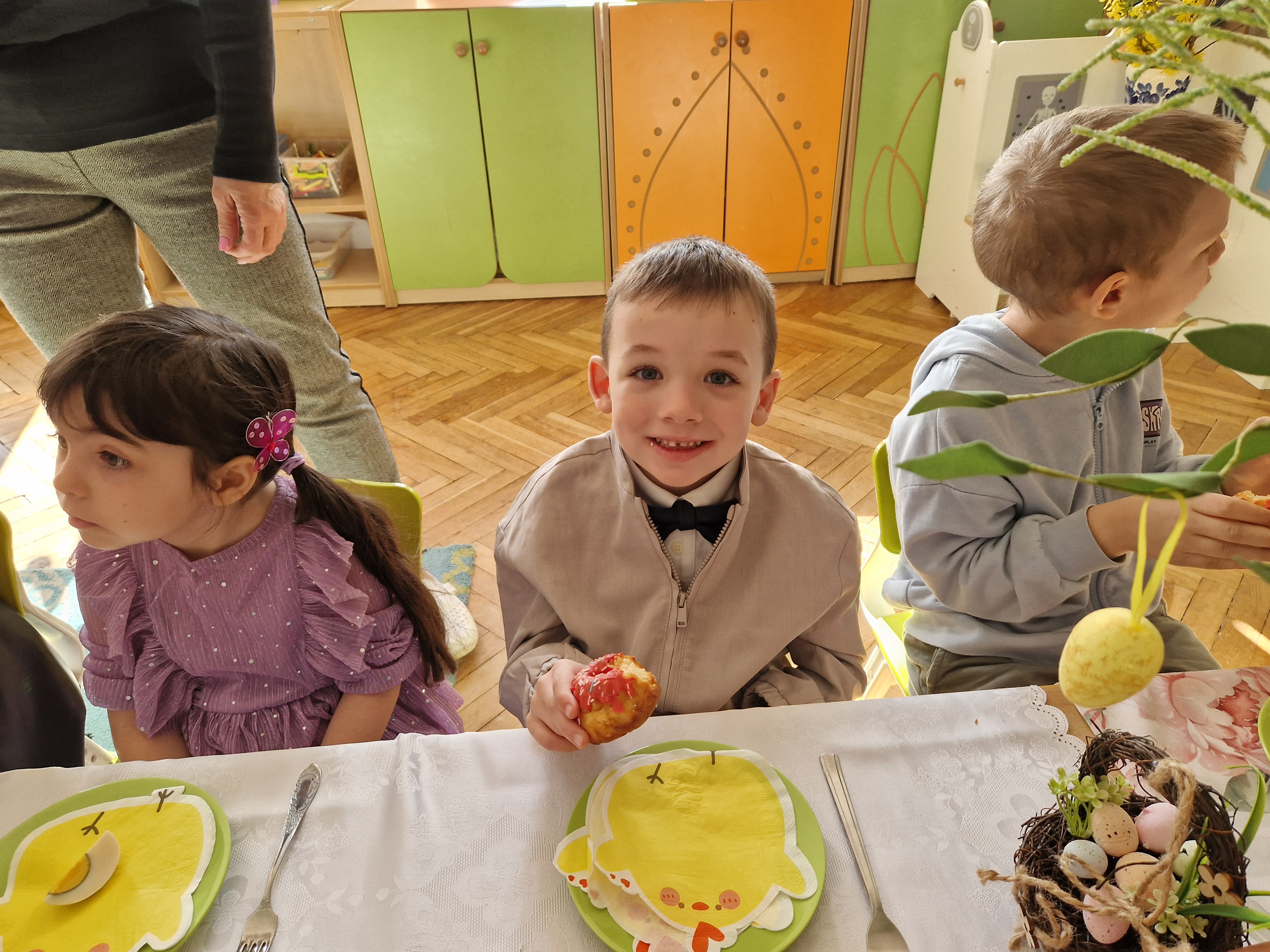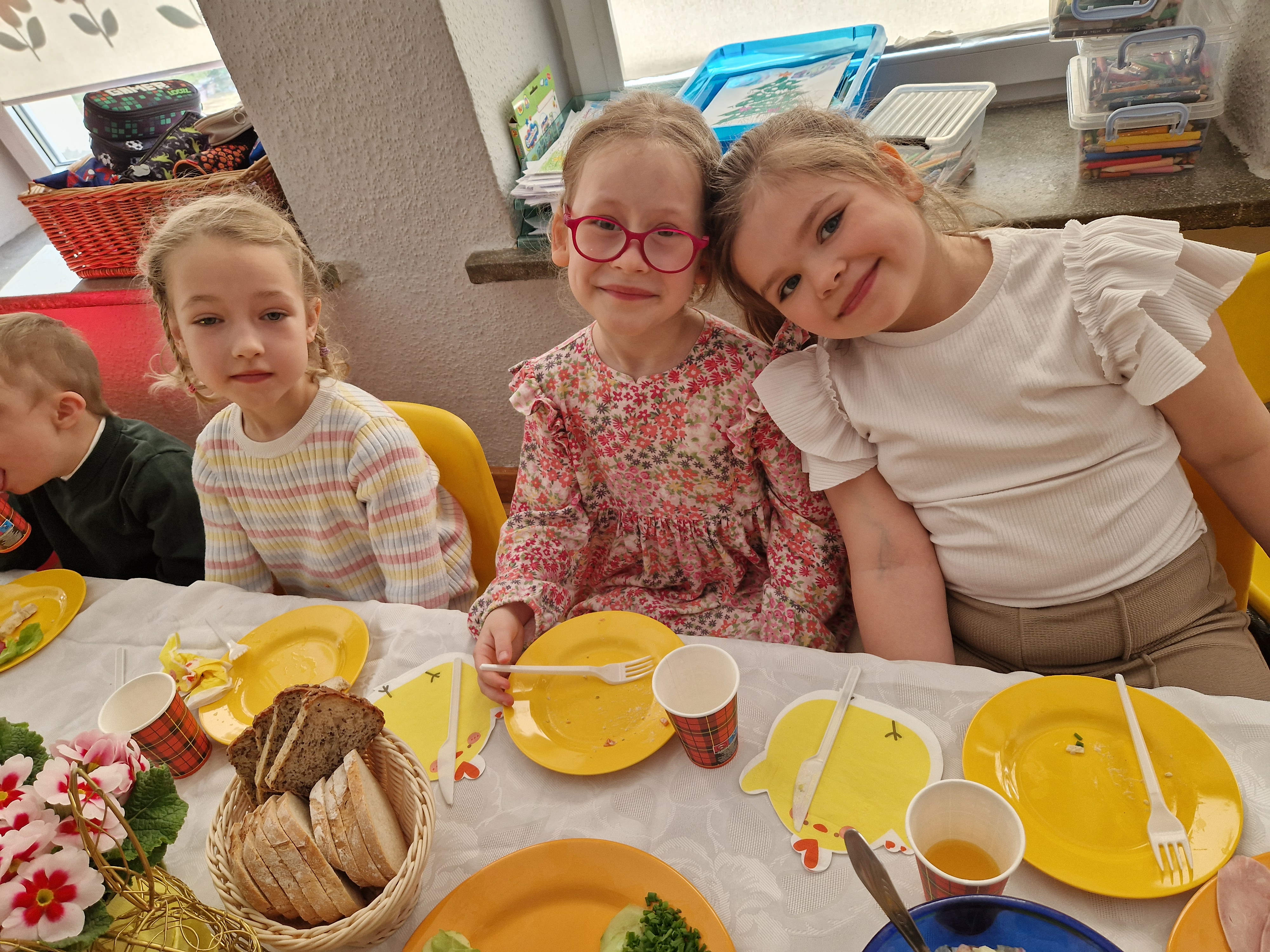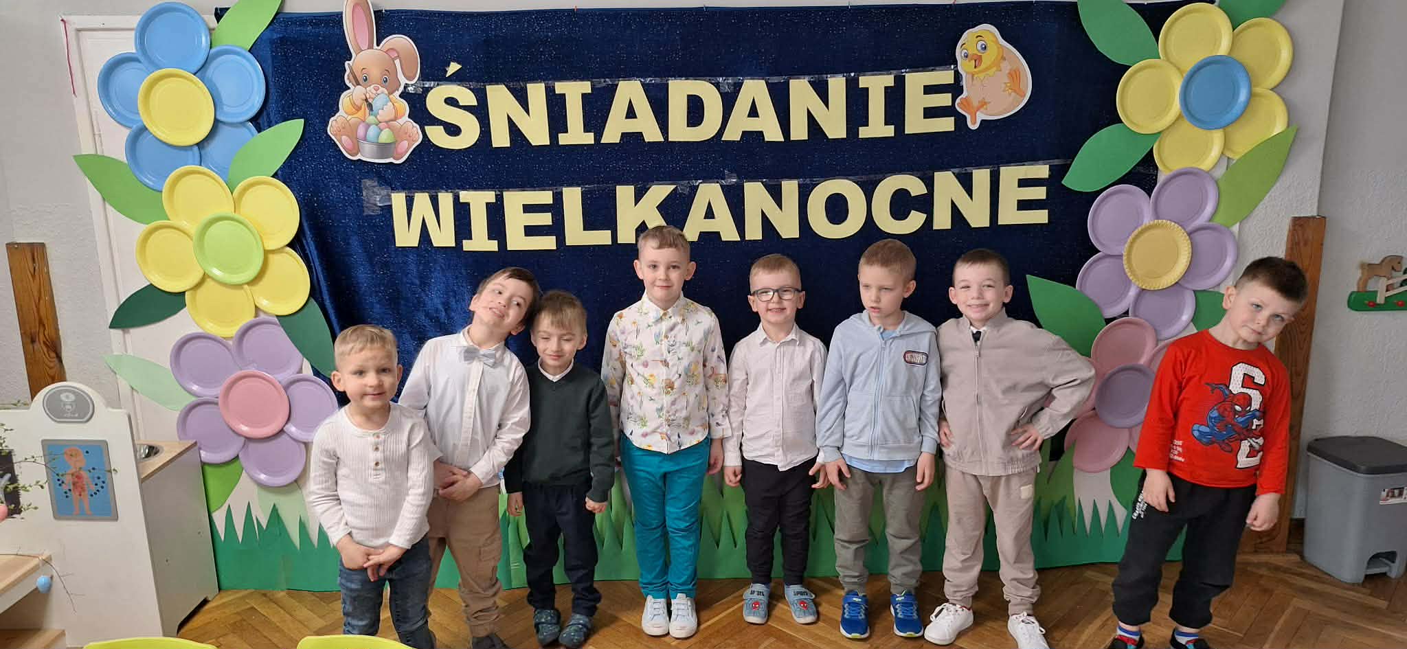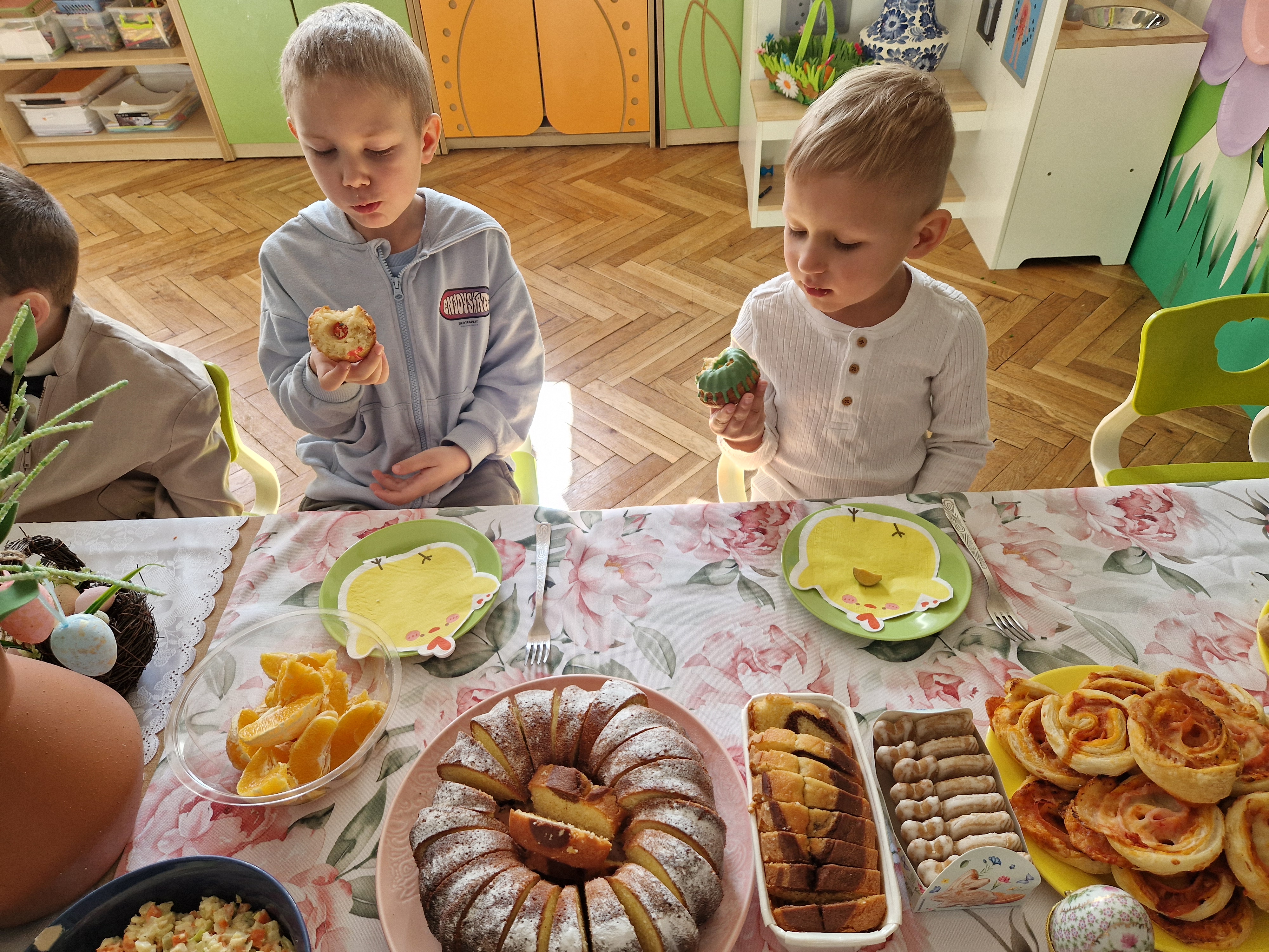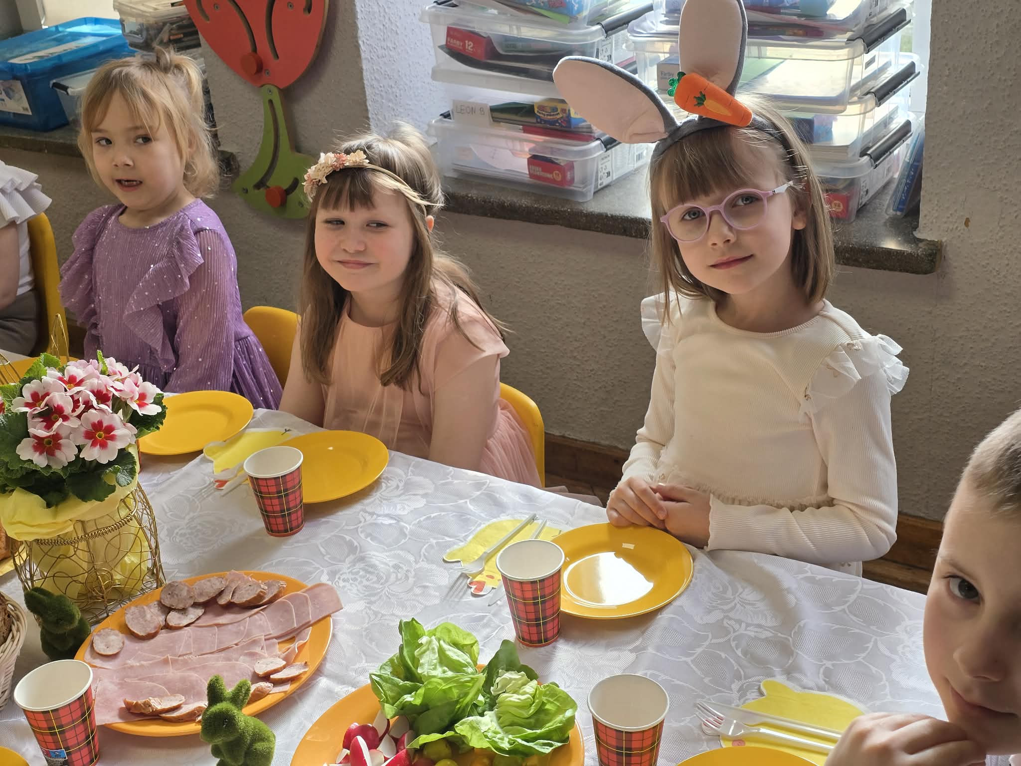 W środę 1 kwietnia w naszym przedszkolu odbyło się uroczyste śniadanie wielkanocne. Na świątecznych stołach nie mogło zabraknąć jajka, szyneczki, baranka z ciasta, stroików z żonkili i bukszpanów. Śniadanie rozpoczęto się od życzeń, które Pani Dyrektor złożyła każdej z grup. Następnie przedszkolaki w odświętnych strojach zasiadły do pięknych stołów zastawionych pokarmami wielkanocnymi. Ten dzień miał wyjątkowy charakter; dzieci śpiewały piosenki i bawiły się w zabawy związane z tradycjami wielkanocnymi. Po śniadaniu wyszły na plac przedszkolny gdzie zajączek wielkanocny zostawił dla nich ukryte słodkie niespodzianki w postaci czekoladowych jajeczek. Spotkanie przy wspólnym świątecznym stole sprawiło dzieciom wiele radości.