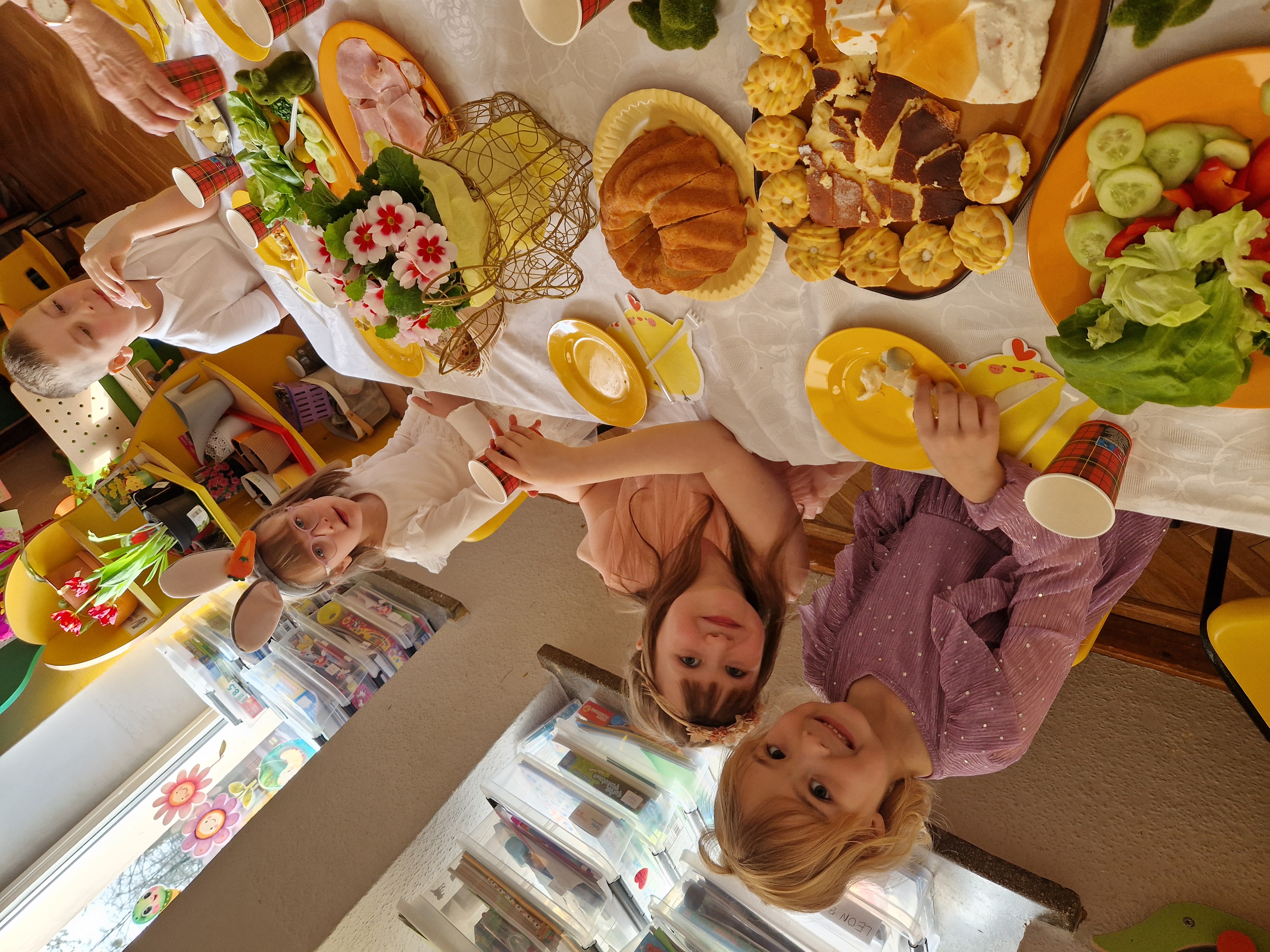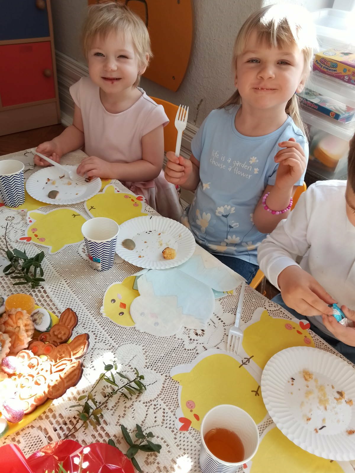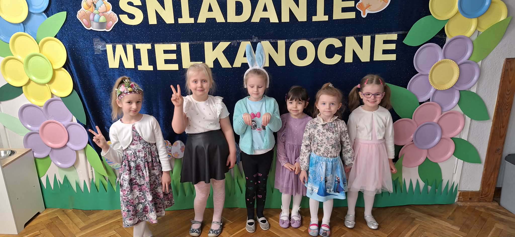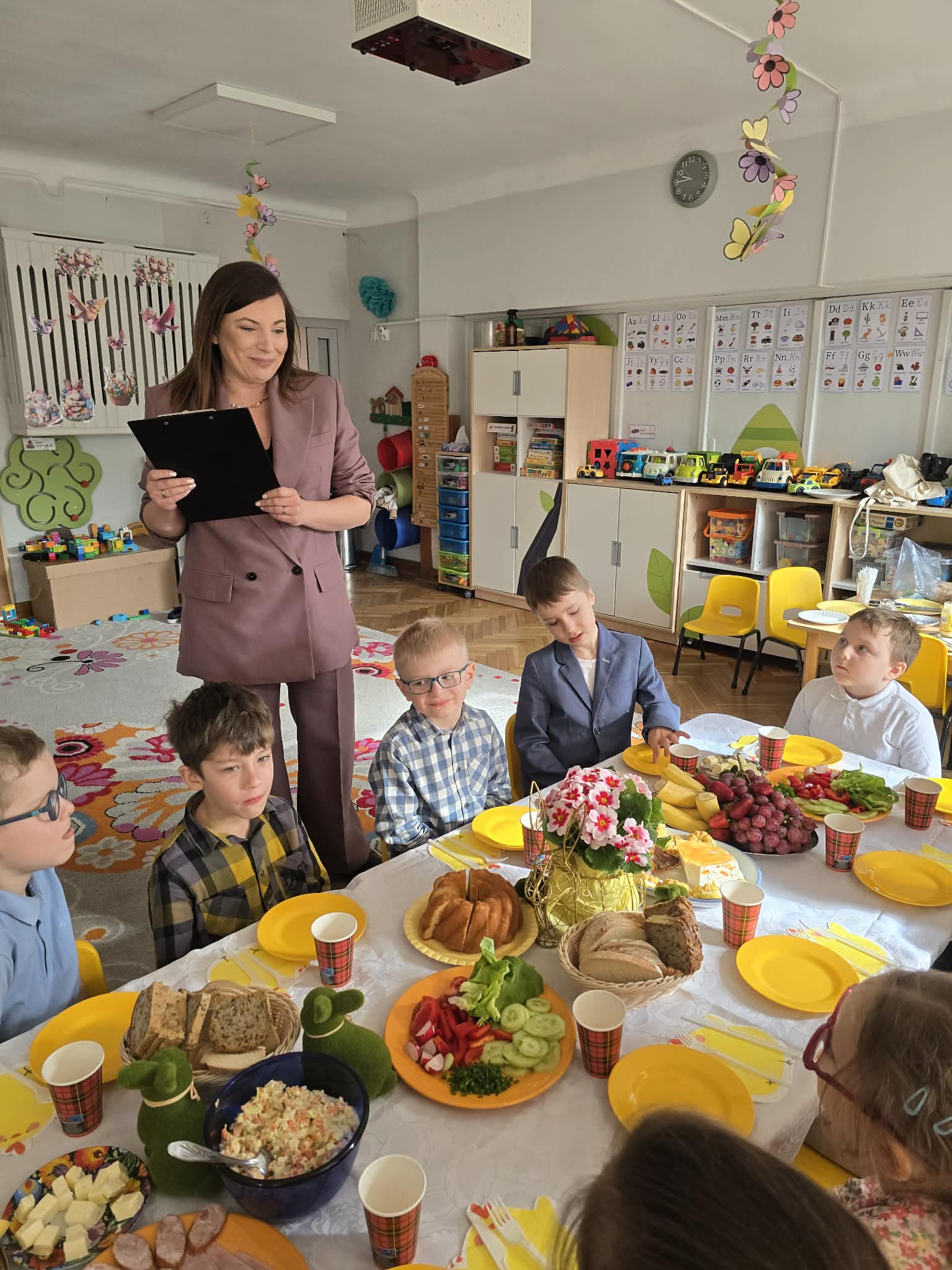W środę 1 kwietnia w naszym przedszkolu odbyło się uroczyste śniadanie wielkanocne. Na świątecznych stołach nie mogło zabraknąć jajka, szyneczki, baranka z ciasta, stroików z żonkili i bukszpanów. Śniadanie rozpoczęto się od życzeń, które Pani Dyrektor złożyła każdej z grup. Następnie przedszkolaki w odświętnych strojach zasiadły do pięknych stołów zastawionych pokarmami wielkanocnymi. Ten dzień miał wyjątkowy charakter; dzieci śpiewały piosenki i bawiły się w zabawy związane z tradycjami wielkanocnymi. Po śniadaniu wyszły na plac przedszkolny gdzie zajączek wielkanocny zostawił dla nich ukryte słodkie niespodzianki w postaci czekoladowych jajeczek. Spotkanie przy wspólnym świątecznym stole sprawiło dzieciom wiele radości.