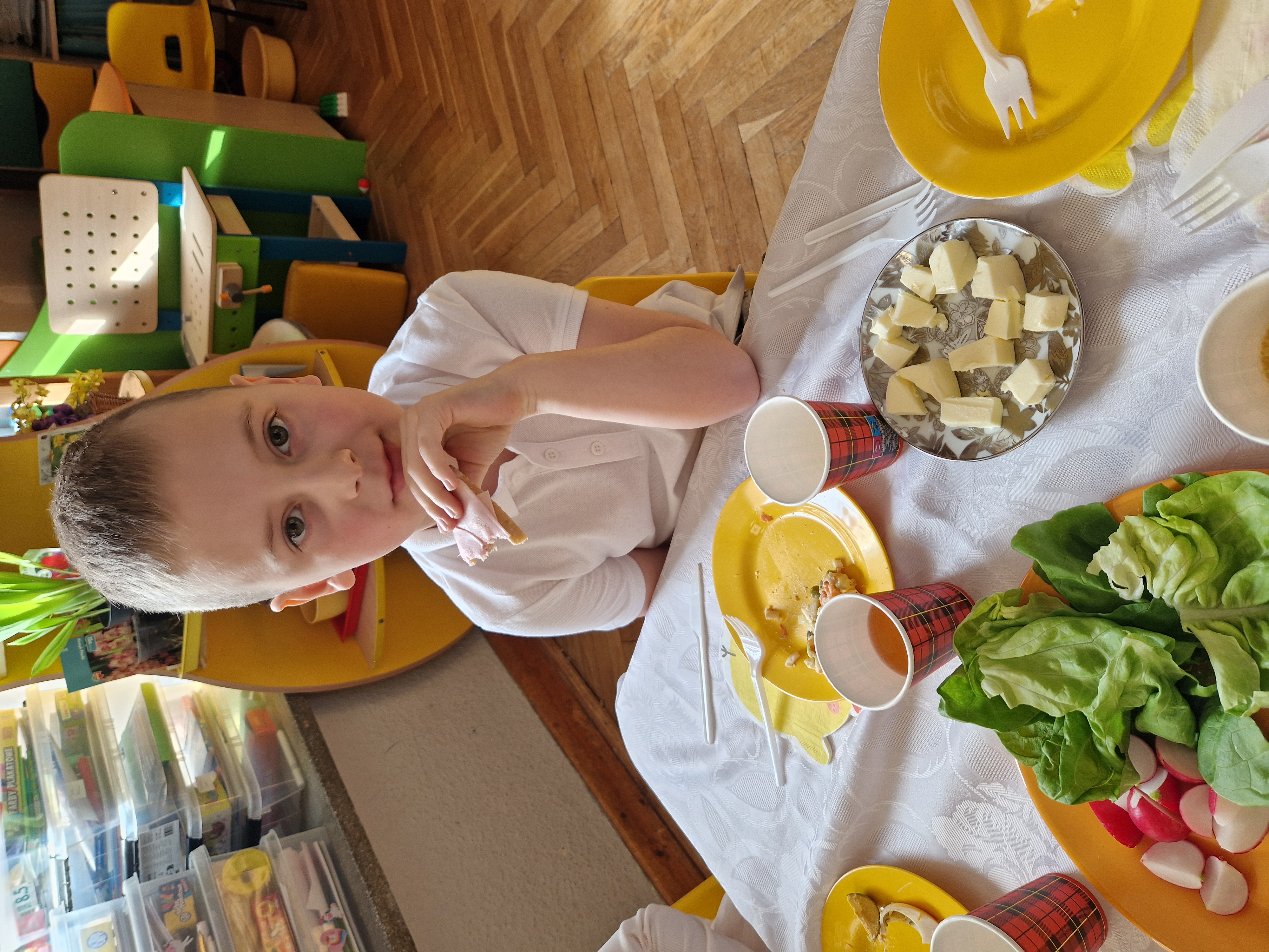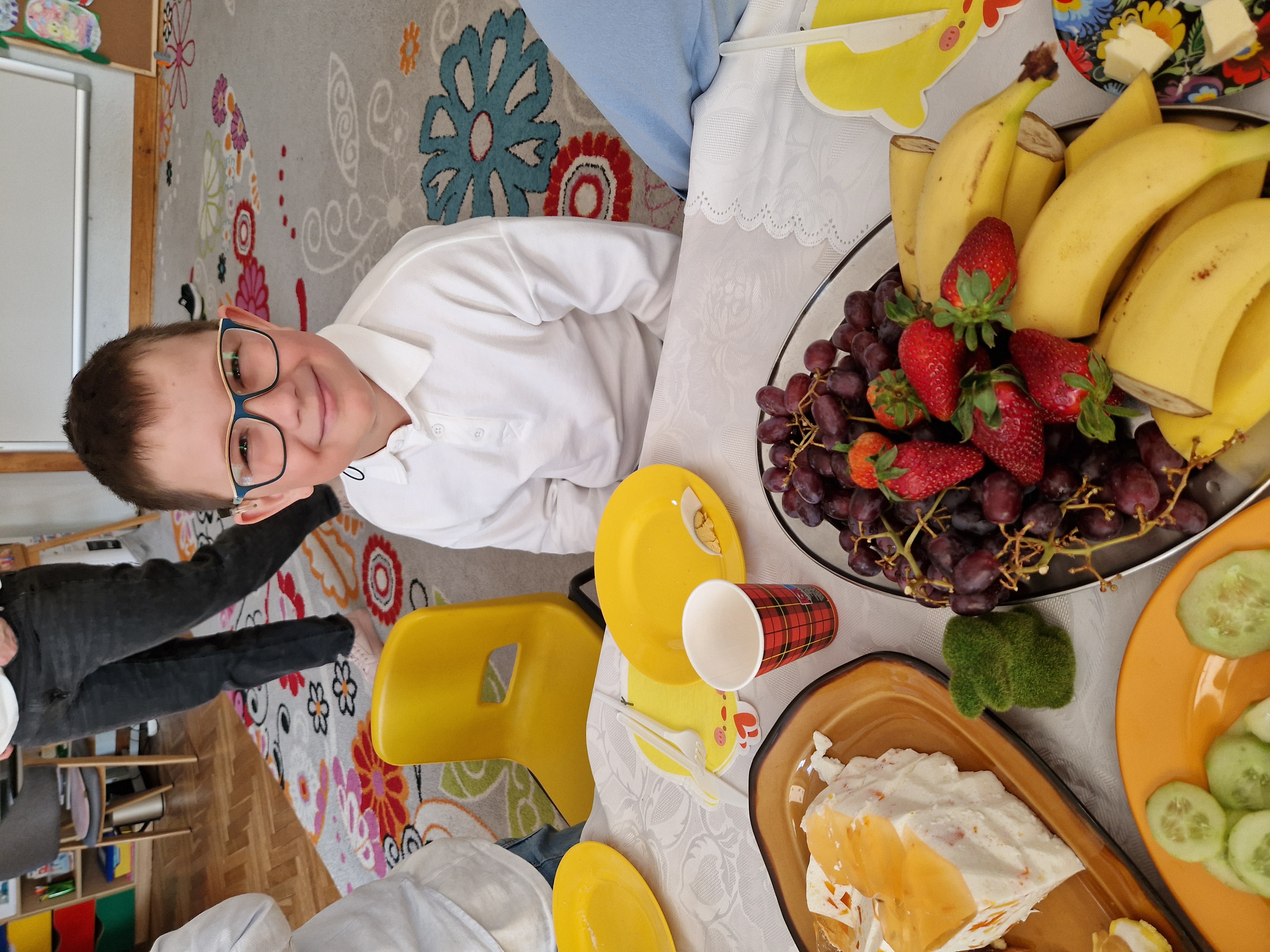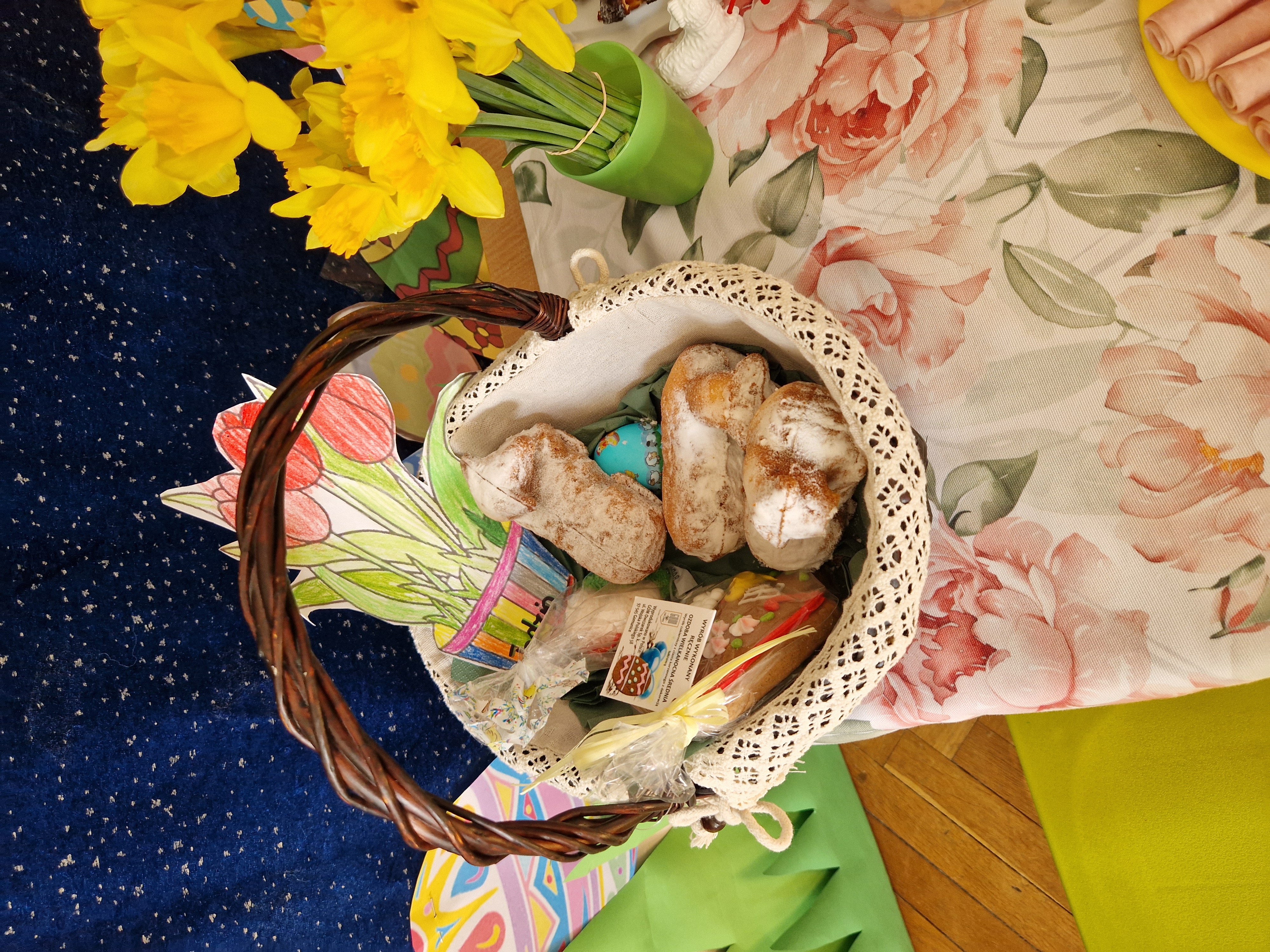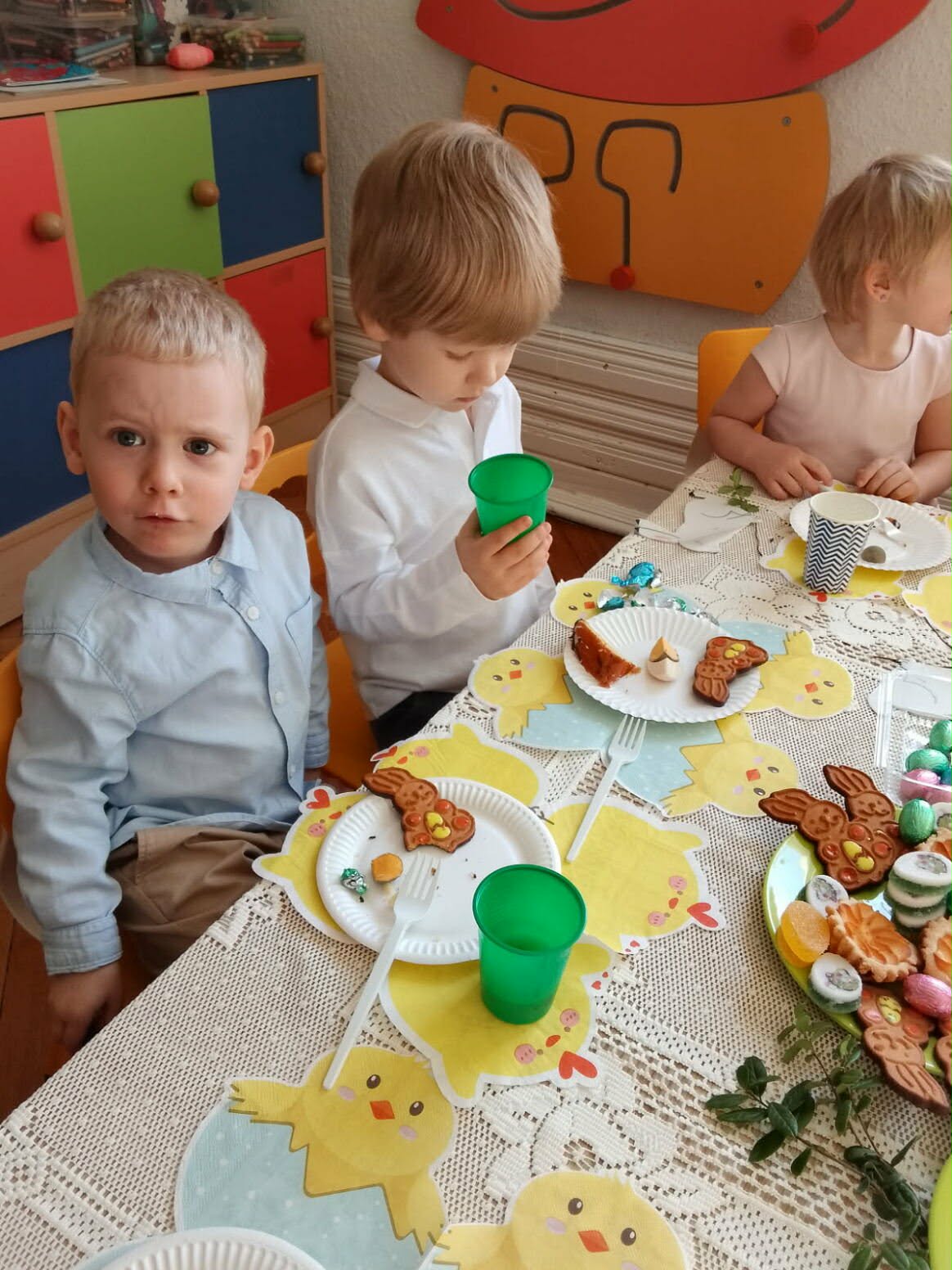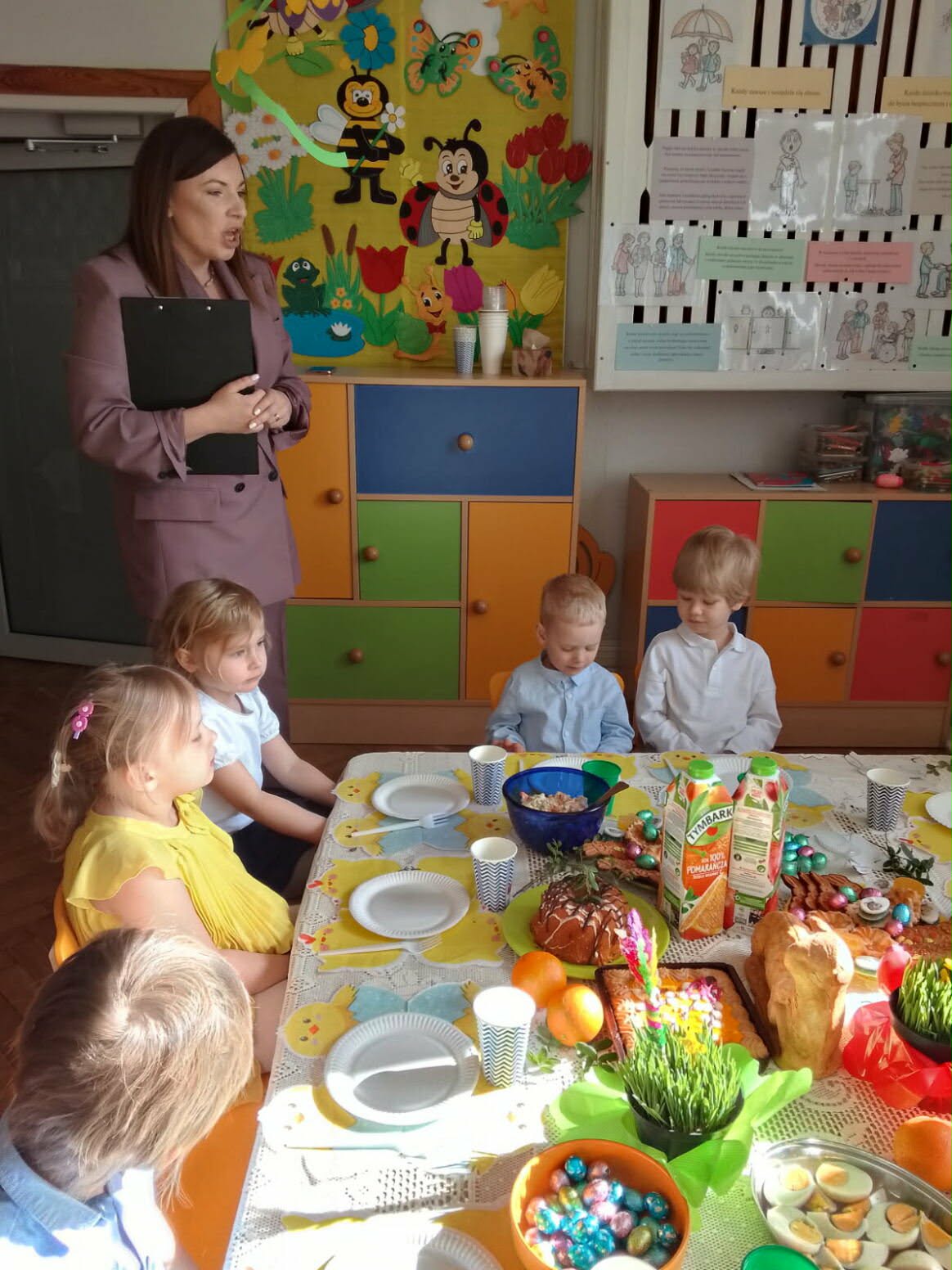 W środę 1 kwietnia w naszym przedszkolu odbyło się uroczyste śniadanie wielkanocne. Na świątecznych stołach nie mogło zabraknąć jajka, szyneczki, baranka z ciasta, stroików z żonkili i bukszpanów. Śniadanie rozpoczęto się od życzeń, które Pani Dyrektor złożyła każdej z grup. Następnie przedszkolaki w odświętnych strojach zasiadły do pięknych stołów zastawionych pokarmami wielkanocnymi. Ten dzień miał wyjątkowy charakter; dzieci śpiewały piosenki i bawiły się w zabawy związane z tradycjami wielkanocnymi. Po śniadaniu wyszły na plac przedszkolny gdzie zajączek wielkanocny zostawił dla nich ukryte słodkie niespodzianki w postaci czekoladowych jajeczek. Spotkanie przy wspólnym świątecznym stole sprawiło dzieciom wiele radości.